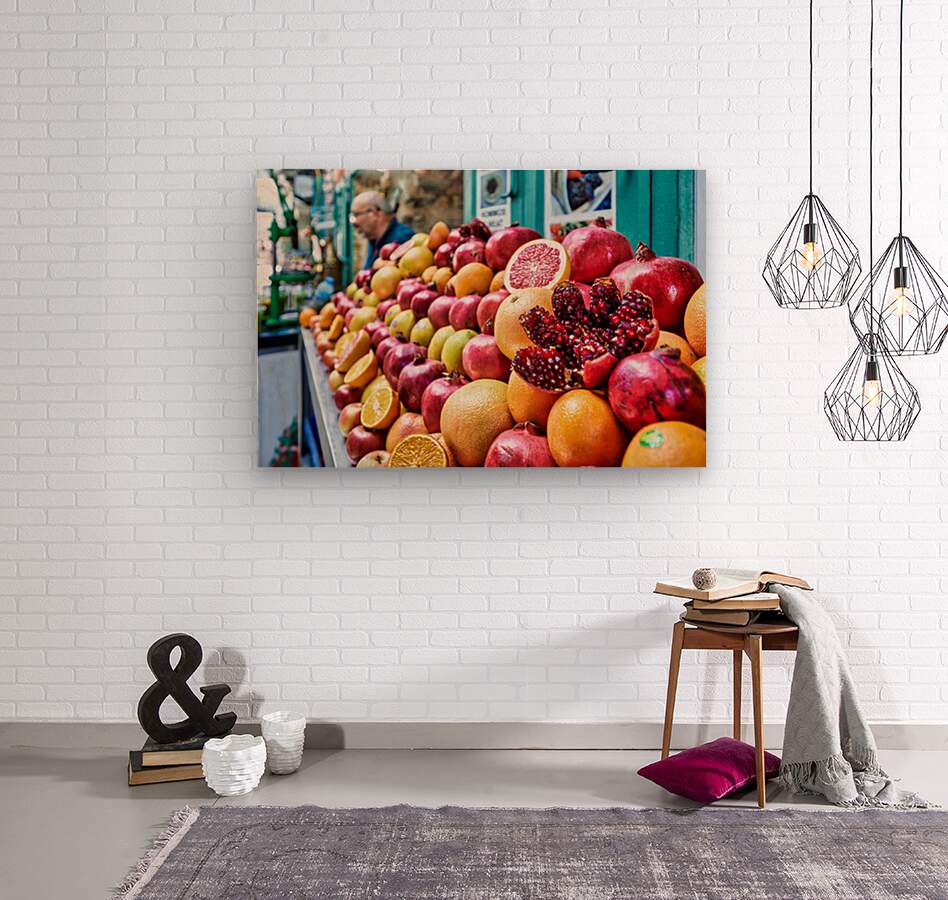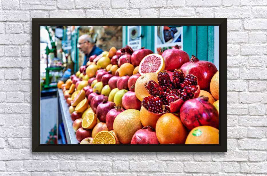 In the old city of Jerusalem a fruit stall offers a variety of fresh fruits like pomegranates and oranges. Customers browse the selection.