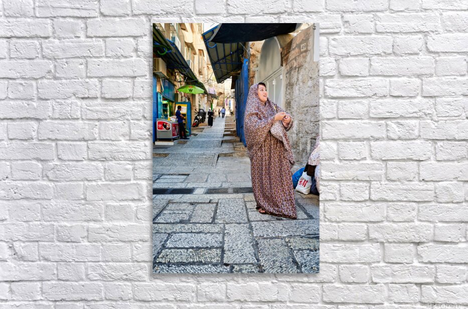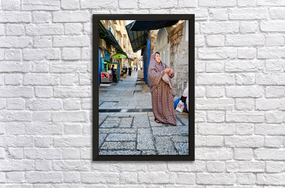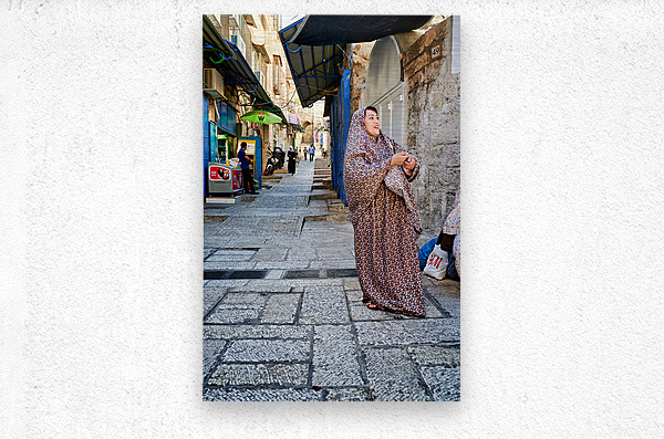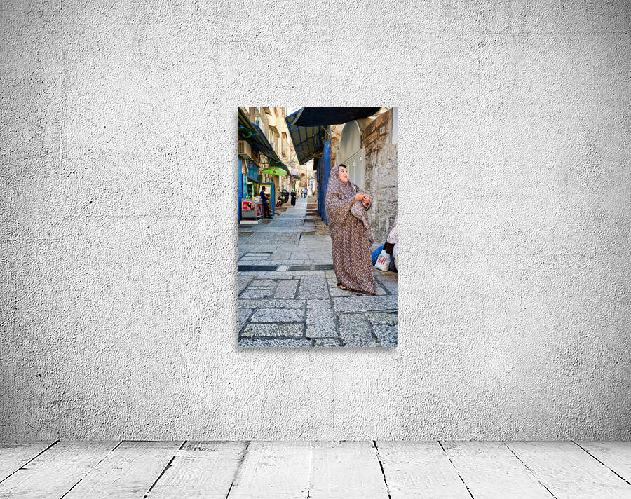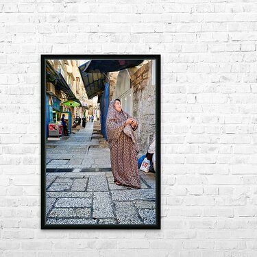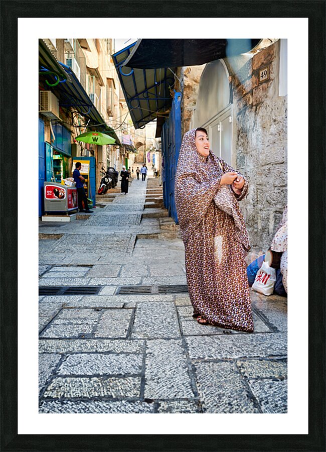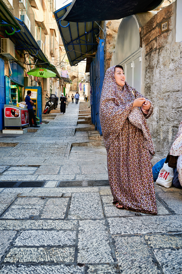 A woman stands in a narrow street in Jerusalem wearing traditional clothing. Shops and people fill the background of the busy area.