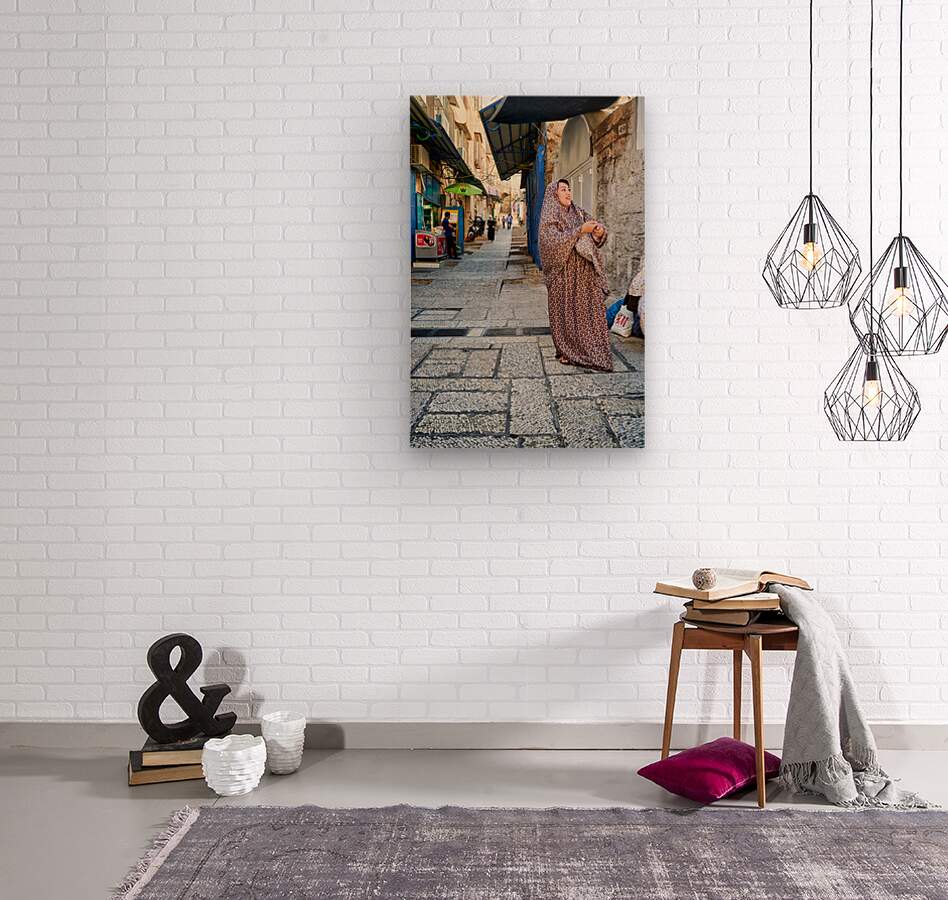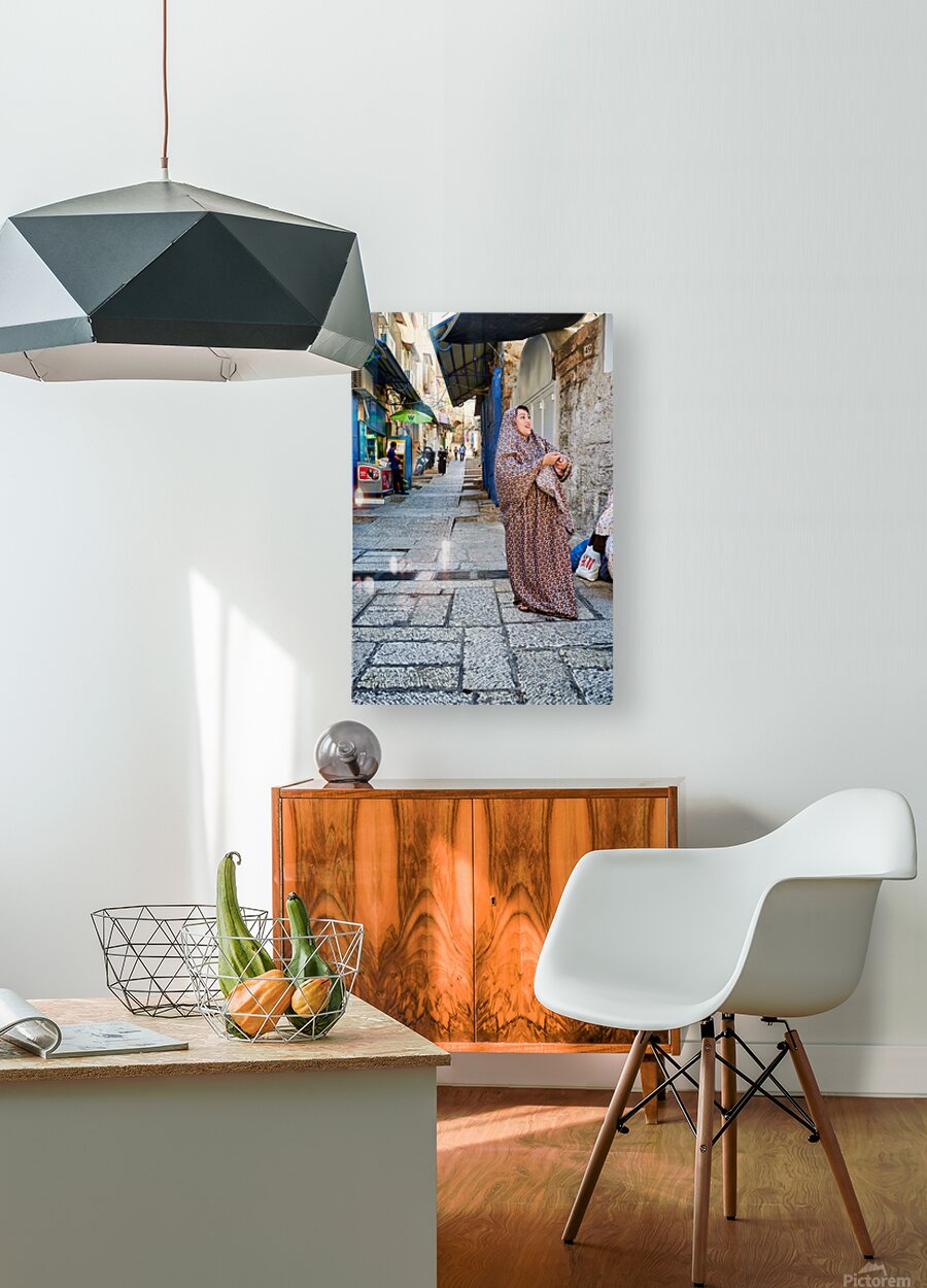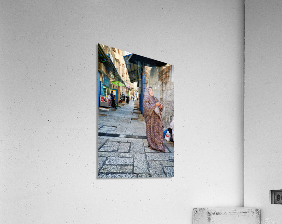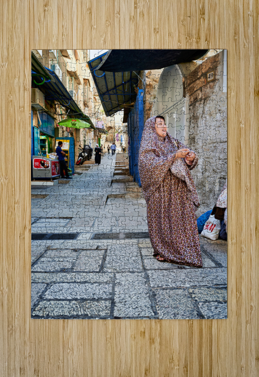 A woman stands in a narrow street in Jerusalem wearing traditional clothing. Shops and people fill the background of the busy area.