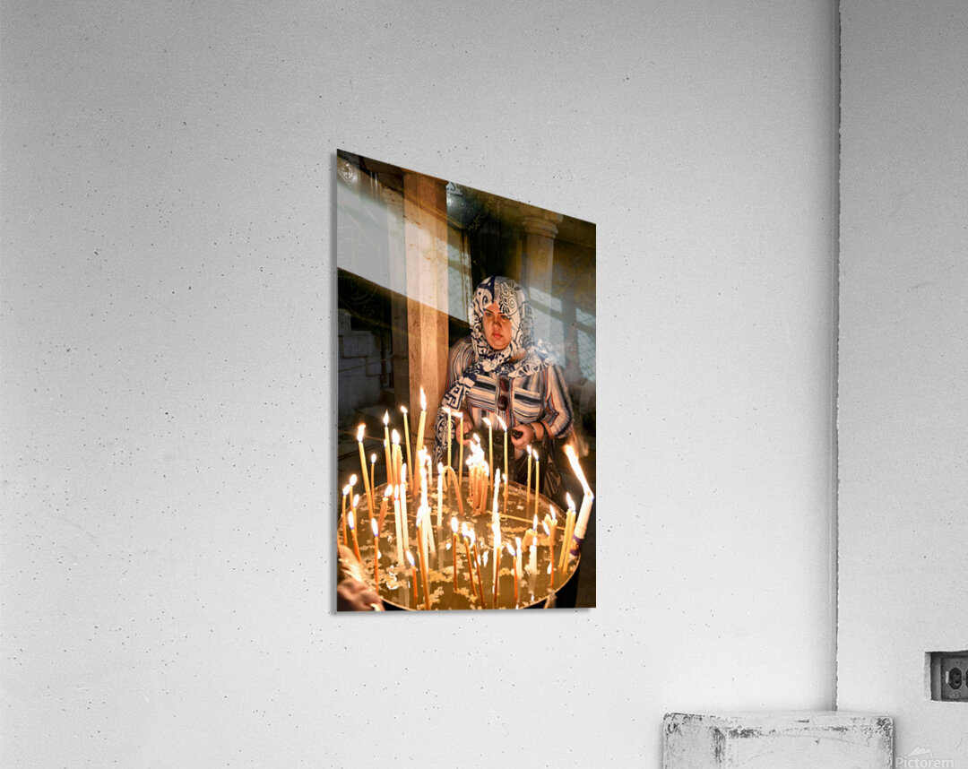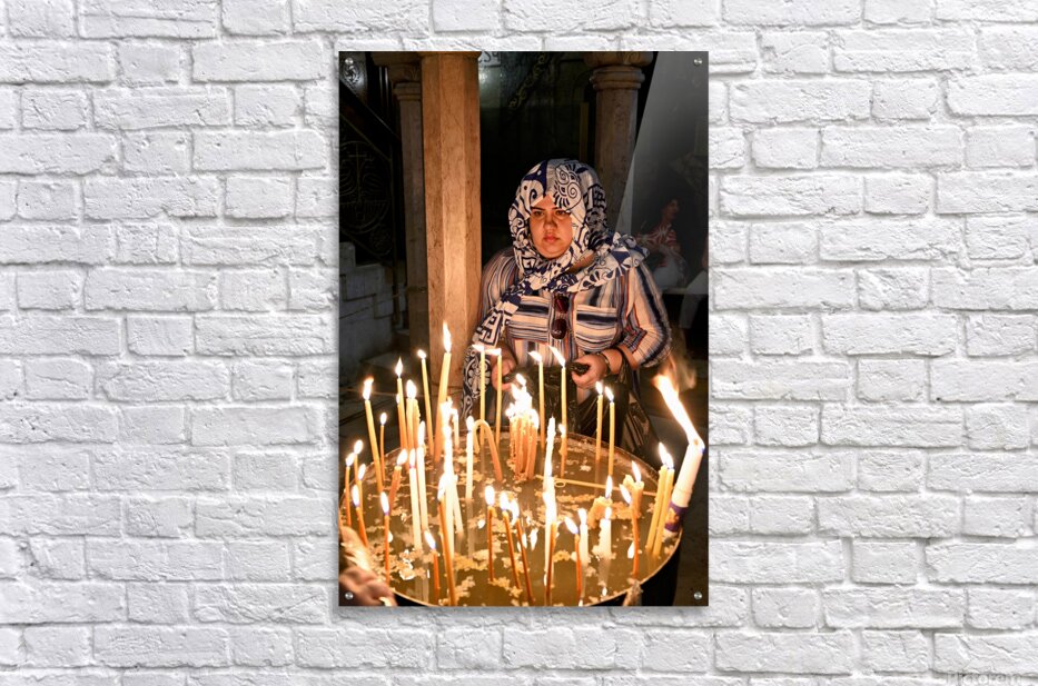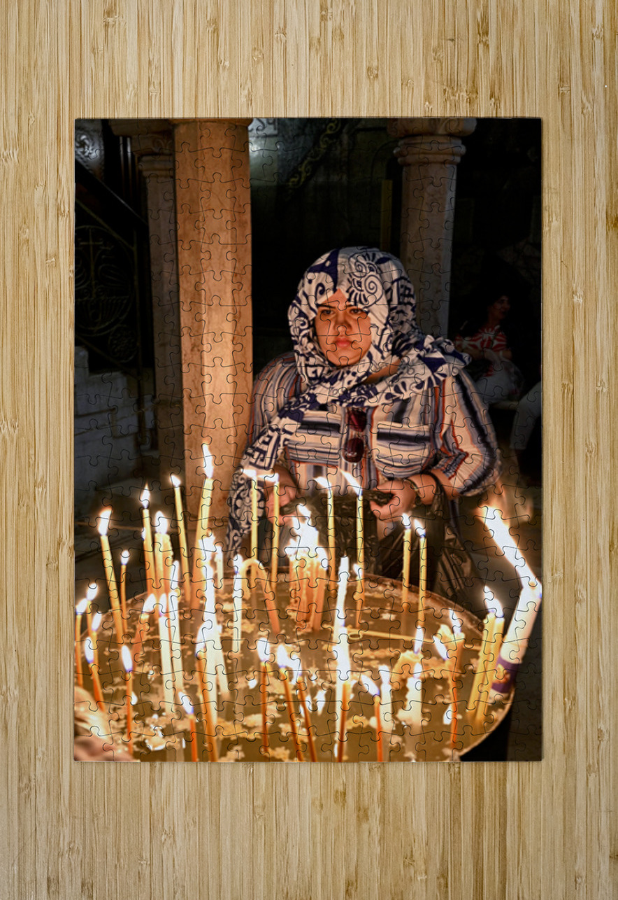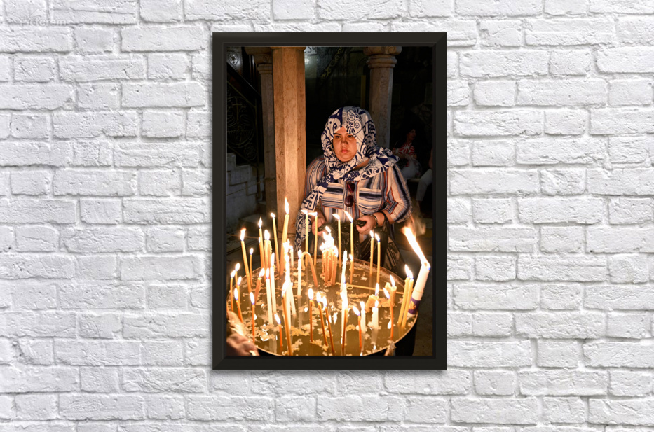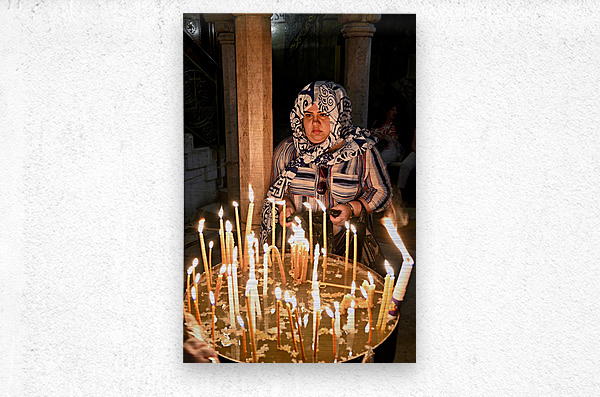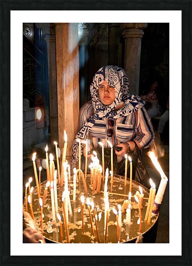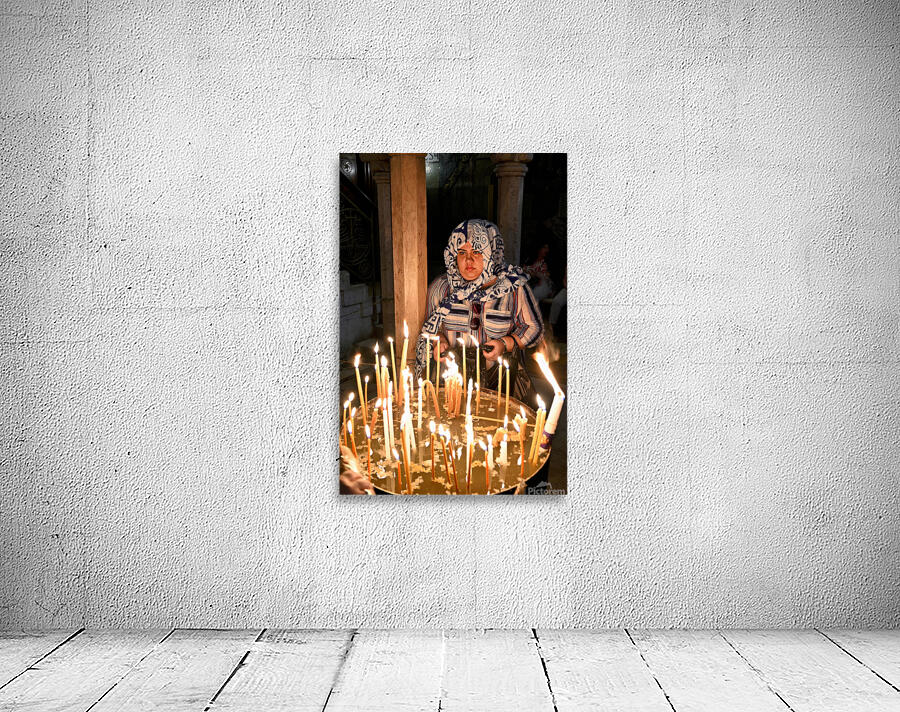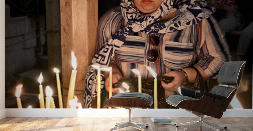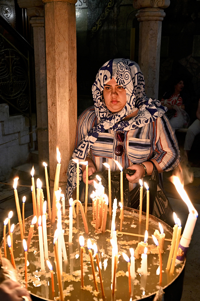 A worshipper lights candles at Holy Sepulchre church in Jerusalem during a religious visit. The atmosphere shows devotion and faith.