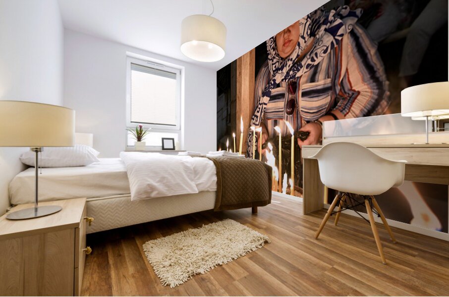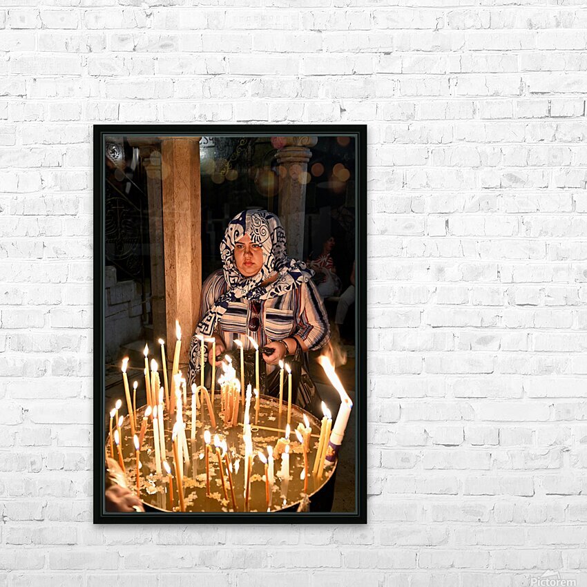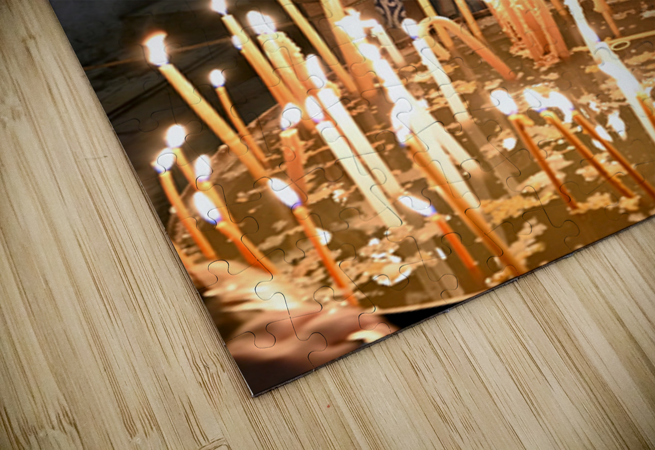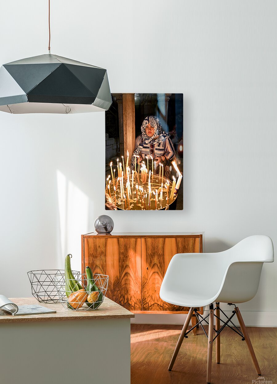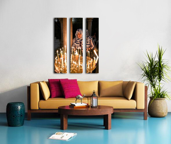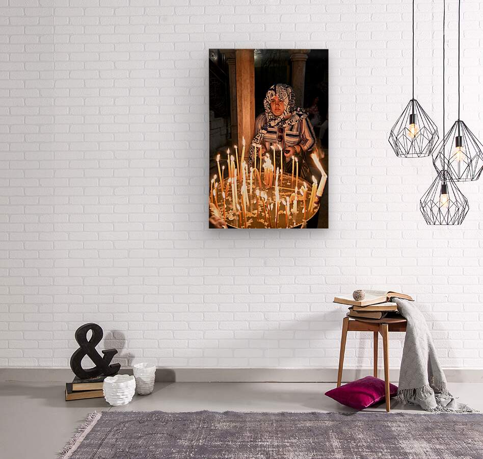 A worshipper lights candles at Holy Sepulchre church in Jerusalem during a religious visit. The atmosphere shows devotion and faith.