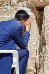 People are praying at the Wailing Wall in Jerusalem. The sun is shining on the stones during the day.