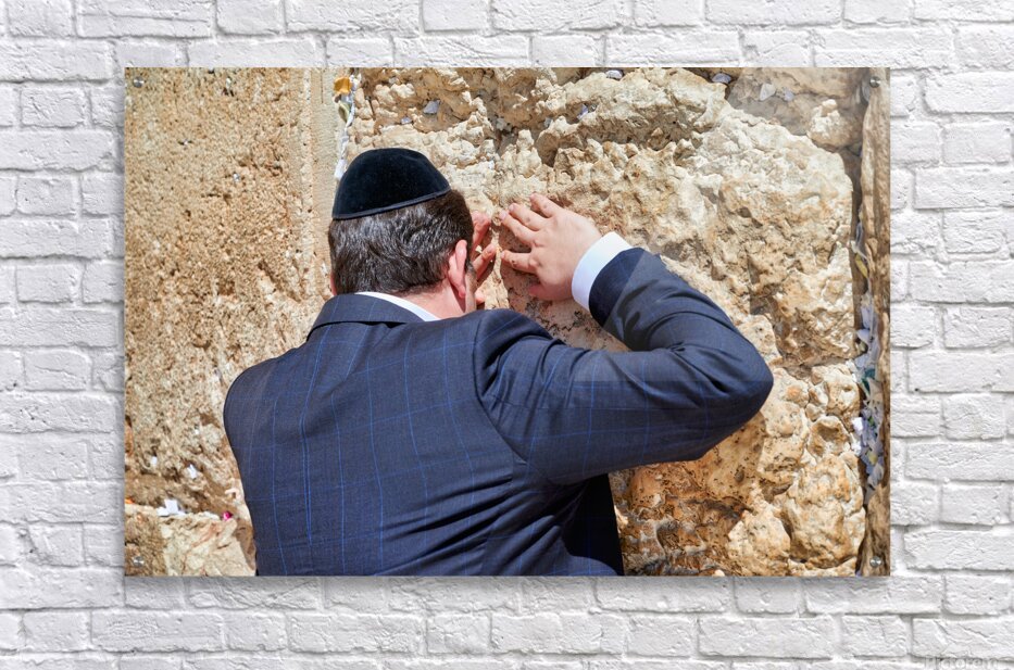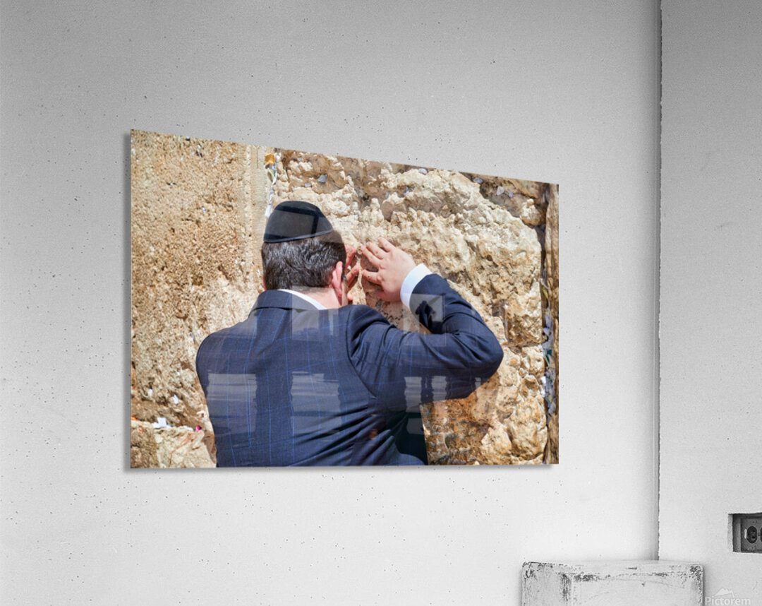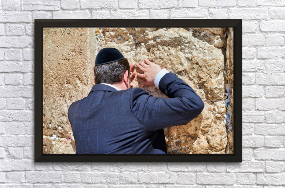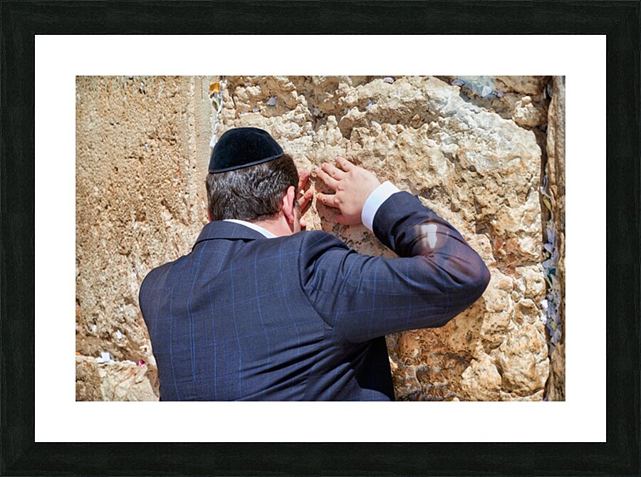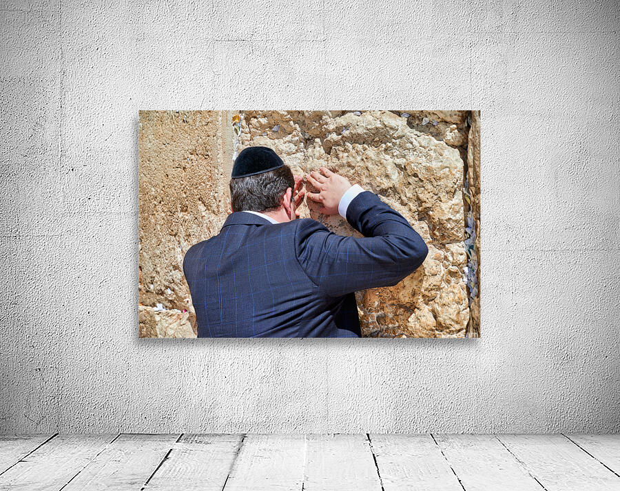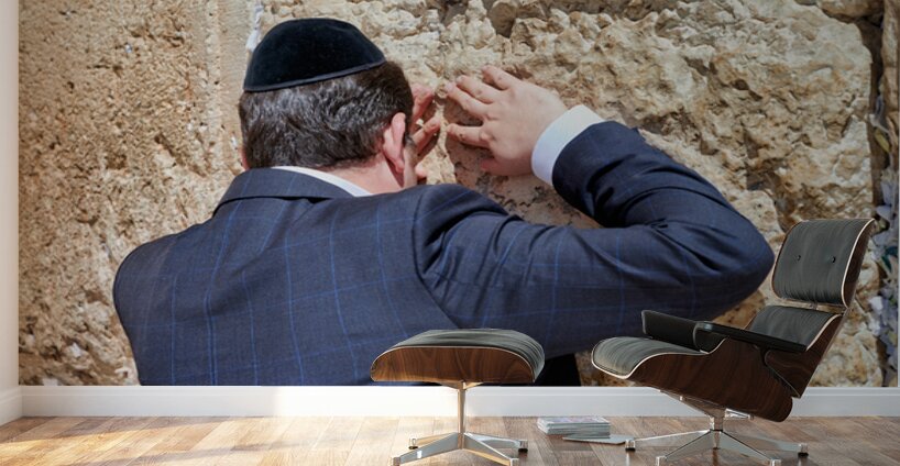 An Orthodox Jew is praying by the Wailing Wall in Jerusalem. The person leans against the stone showing devotion during the prayer.