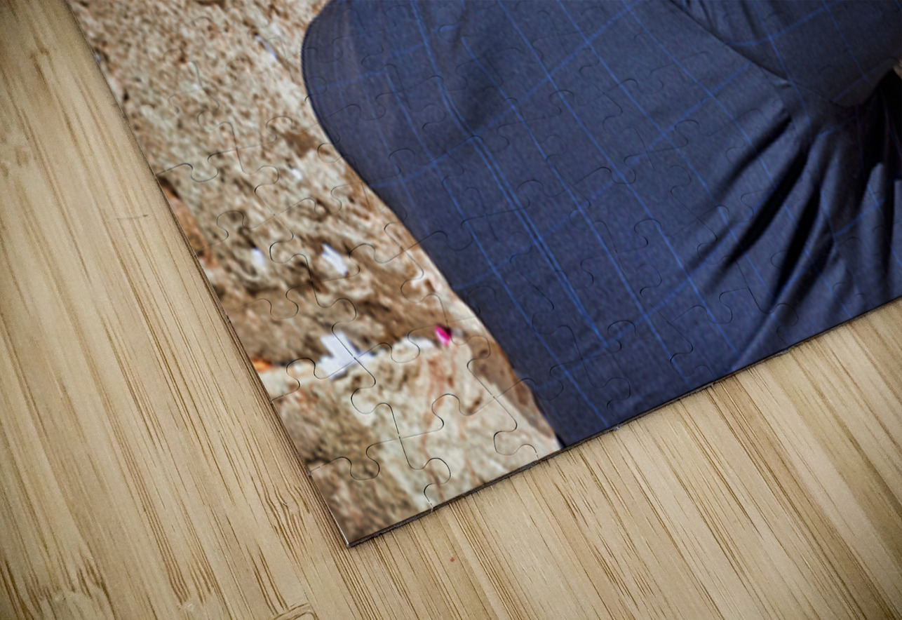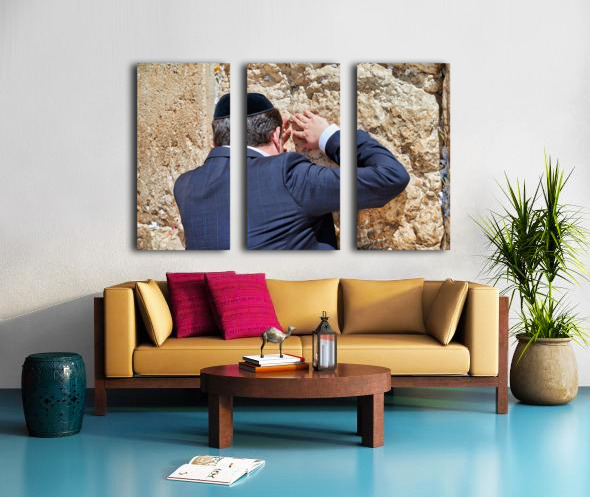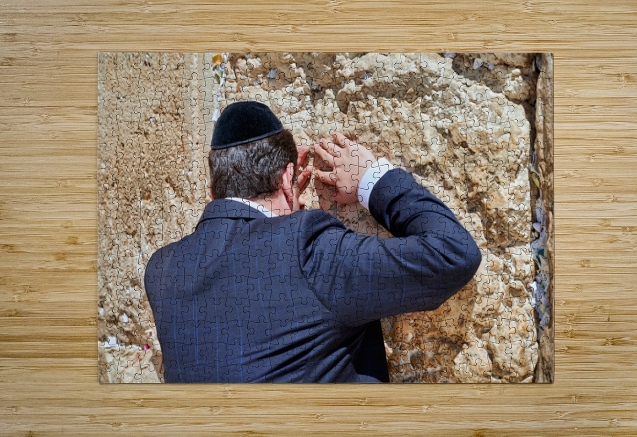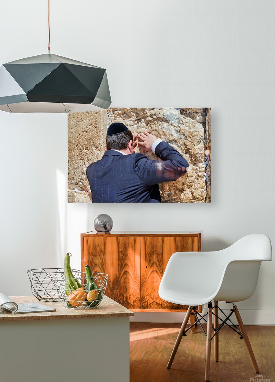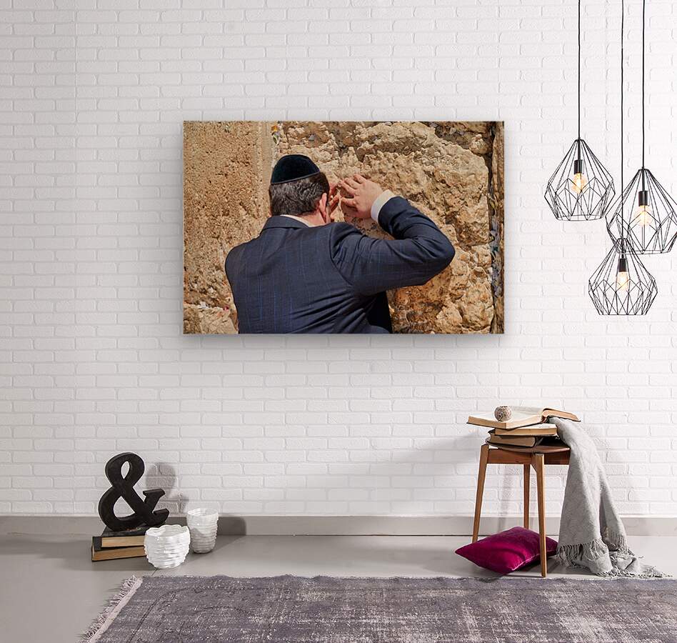 An Orthodox Jew is praying by the Wailing Wall in Jerusalem. The person leans against the stone showing devotion during the prayer.