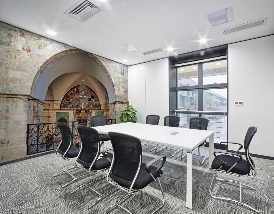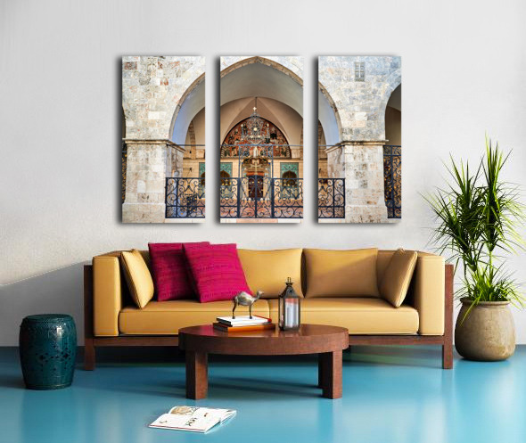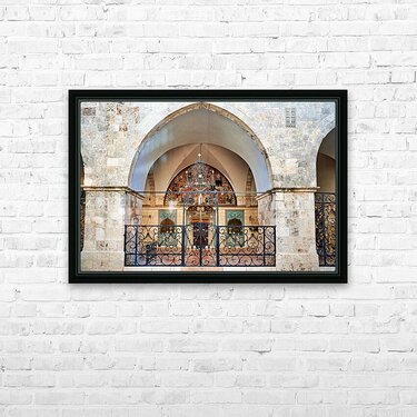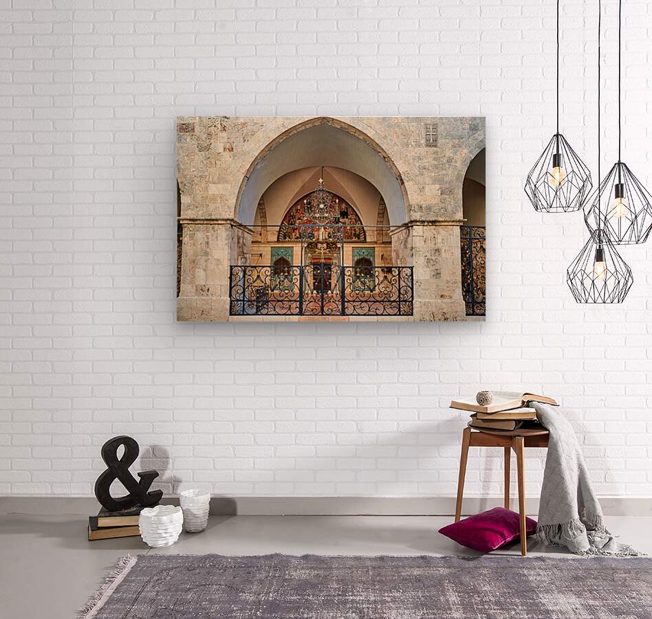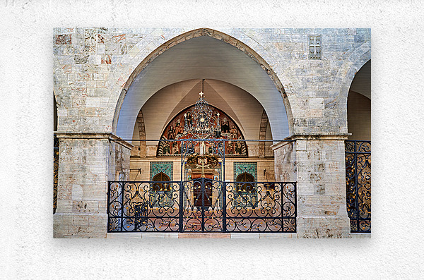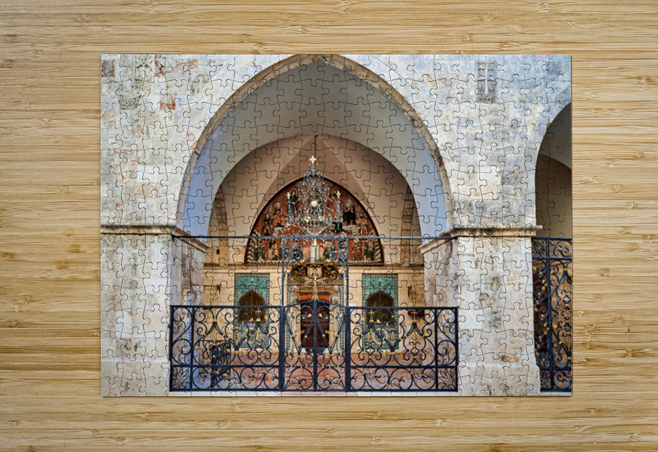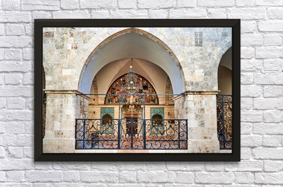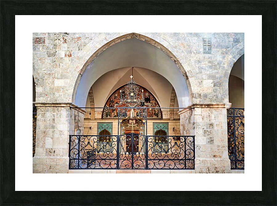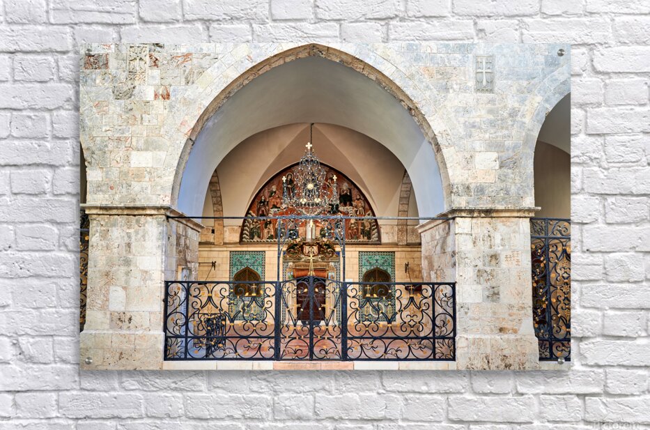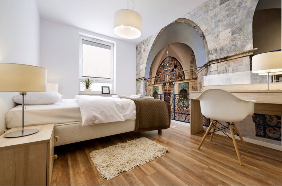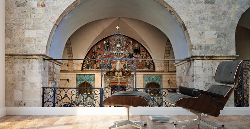 Visitors can see the details of St. James Cathedral in Jerusalem. The church features arches and a decorated altar area.