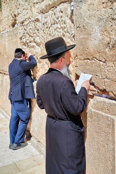 Two Orthodox Jews are praying at the Wailing Wall in Jerusalem. One stands close to the wall while the other is further back.