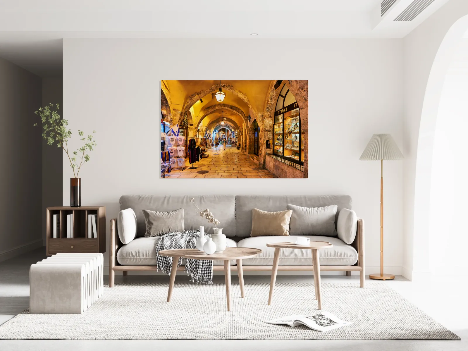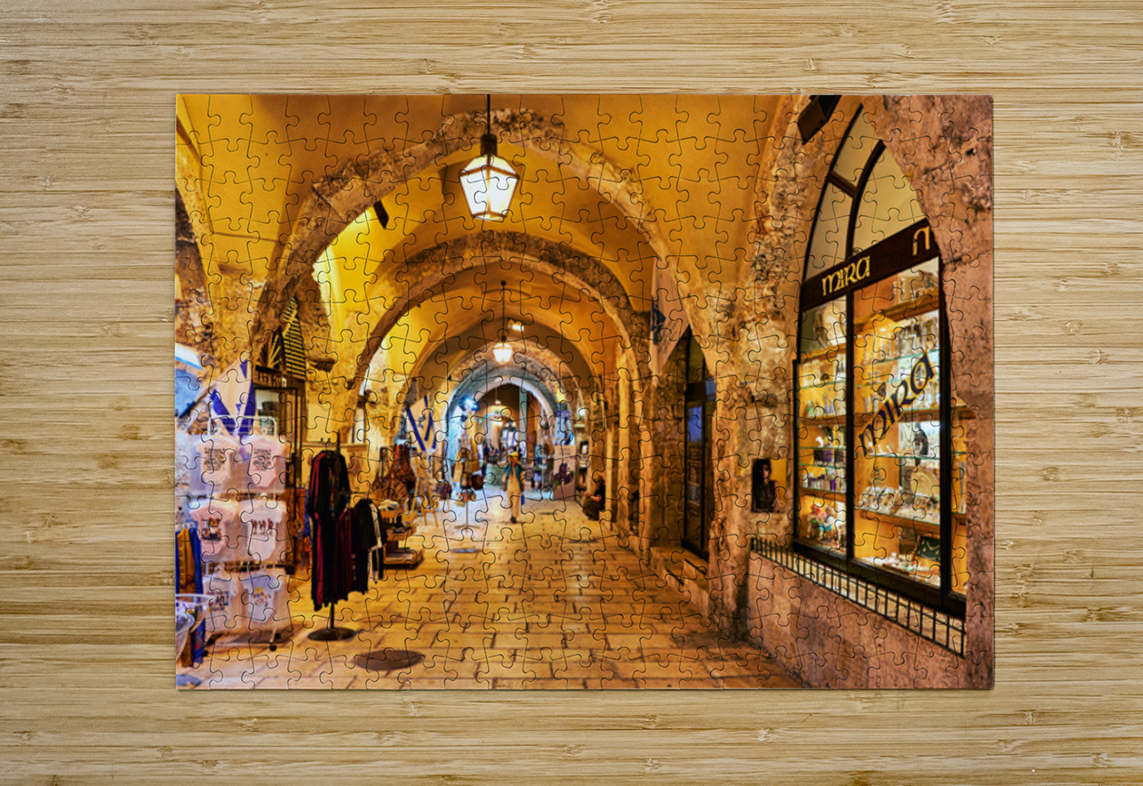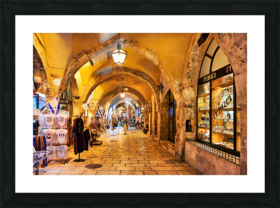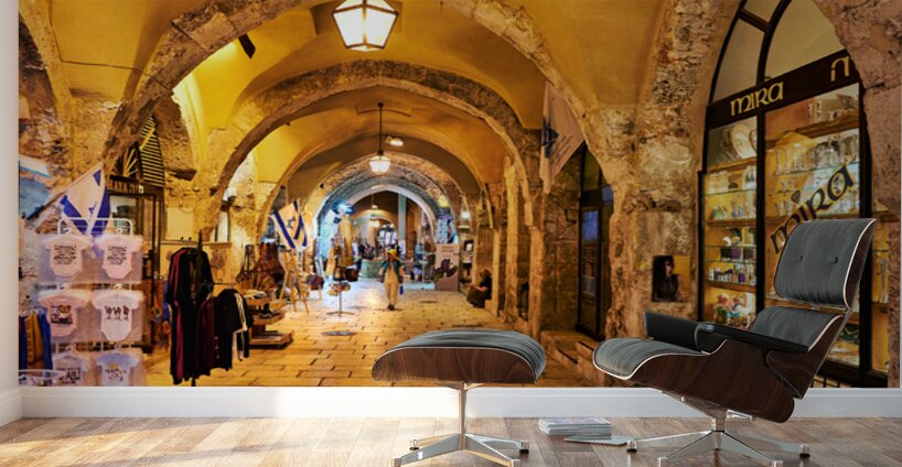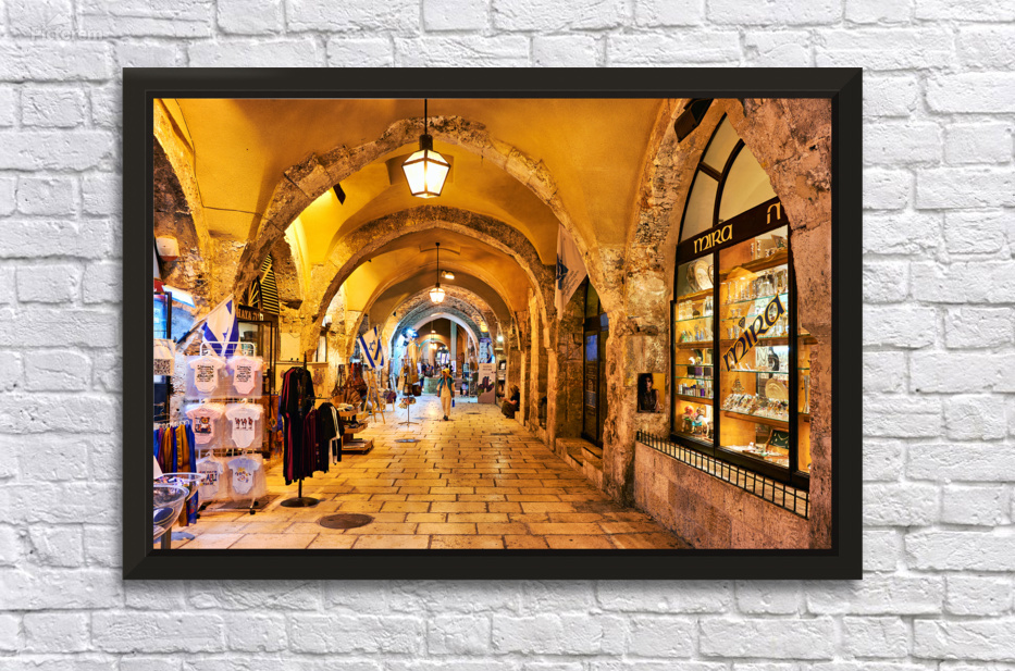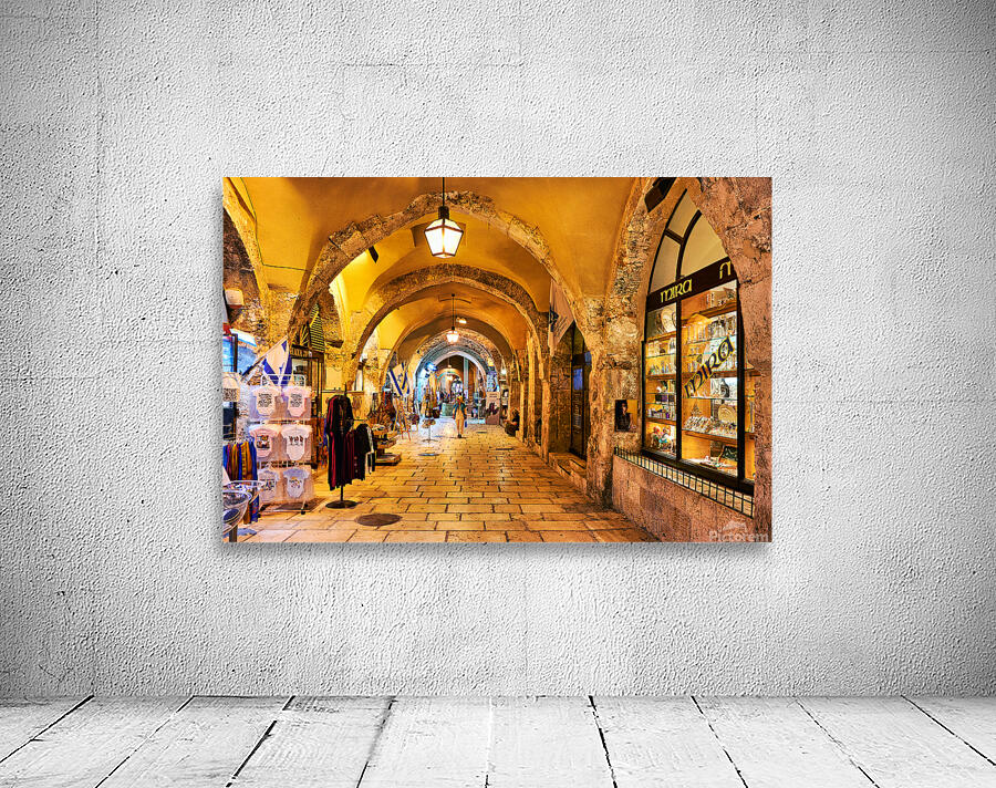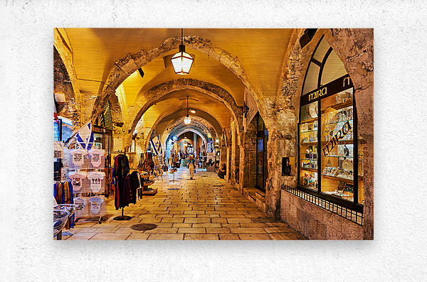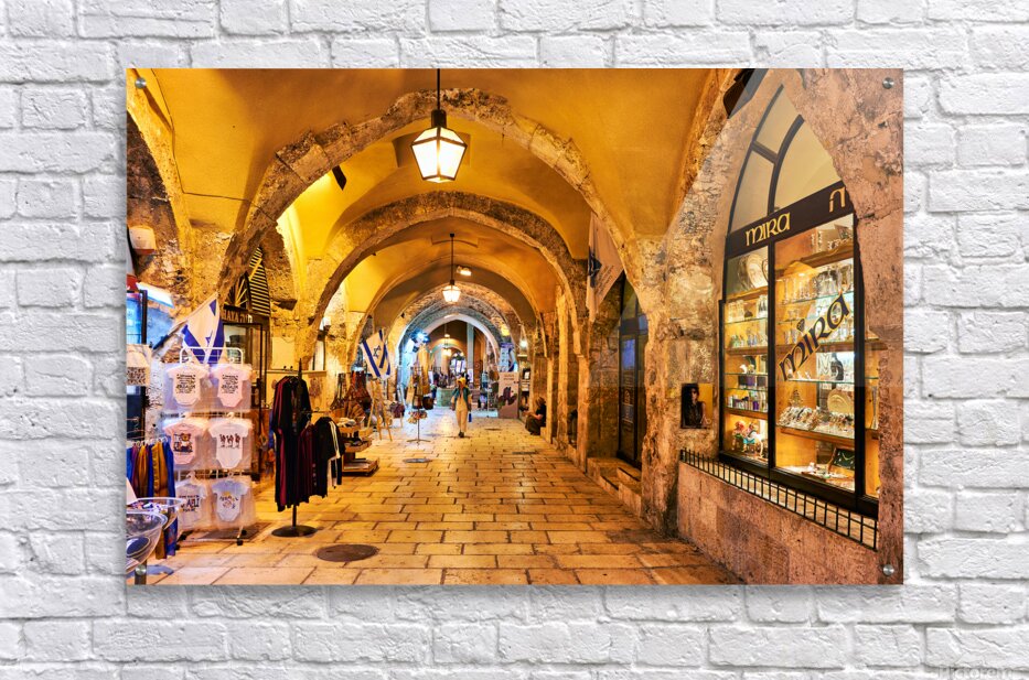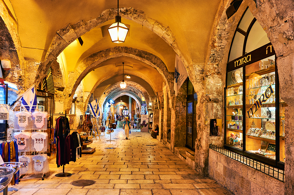 Visitors walk through the Cardo in the Jewish quarter of Jerusalem where shops display various items and local culture is on display.