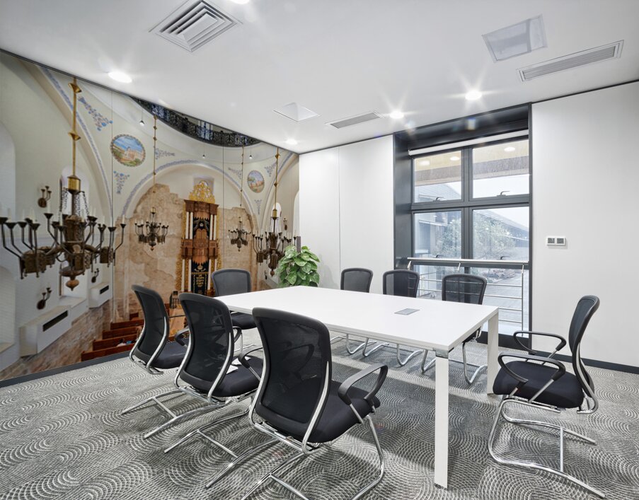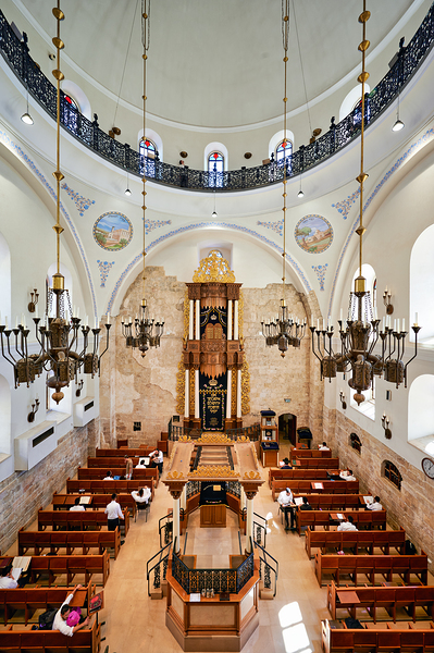 People gather inside Hurva Synagogue in Jerusalem. The setting shows prayer activities and worship.