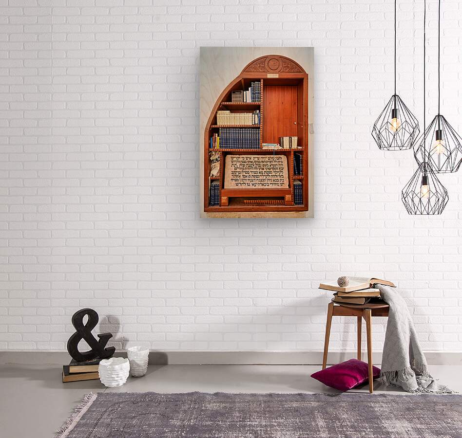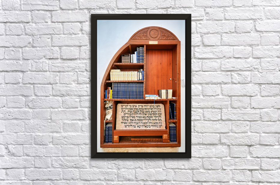 A bookshelf displays various religious texts in four Sephardic synagogues located in Jerusalem Israel. The setting highlights Jewish tradition.