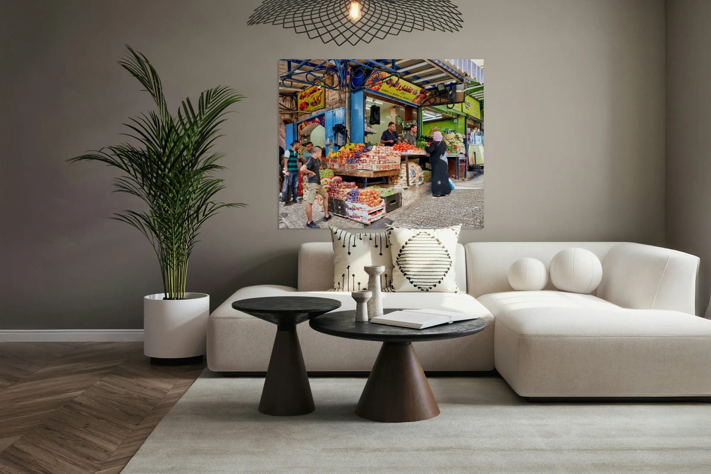 ABOUT THIS ARTWORK: GREENGROCER STALL IN THE OLD CITY OF JERUSALEM BUSY WITH SHOPPER