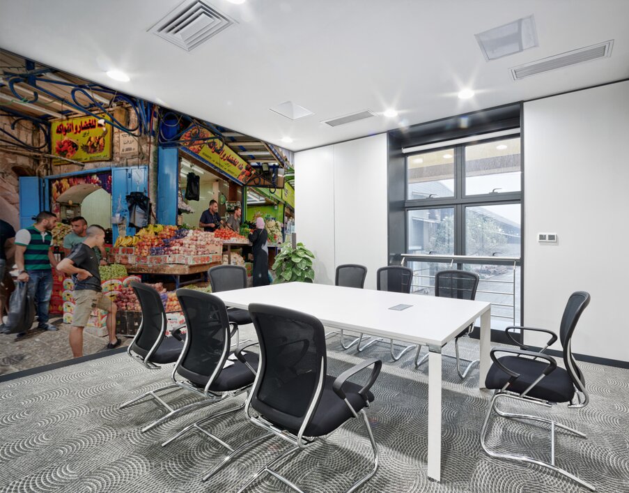 Shoppers browse fresh fruits and vegetables at a greengrocer in the old city of Jerusalem. People engage and buy from the vibrant market.