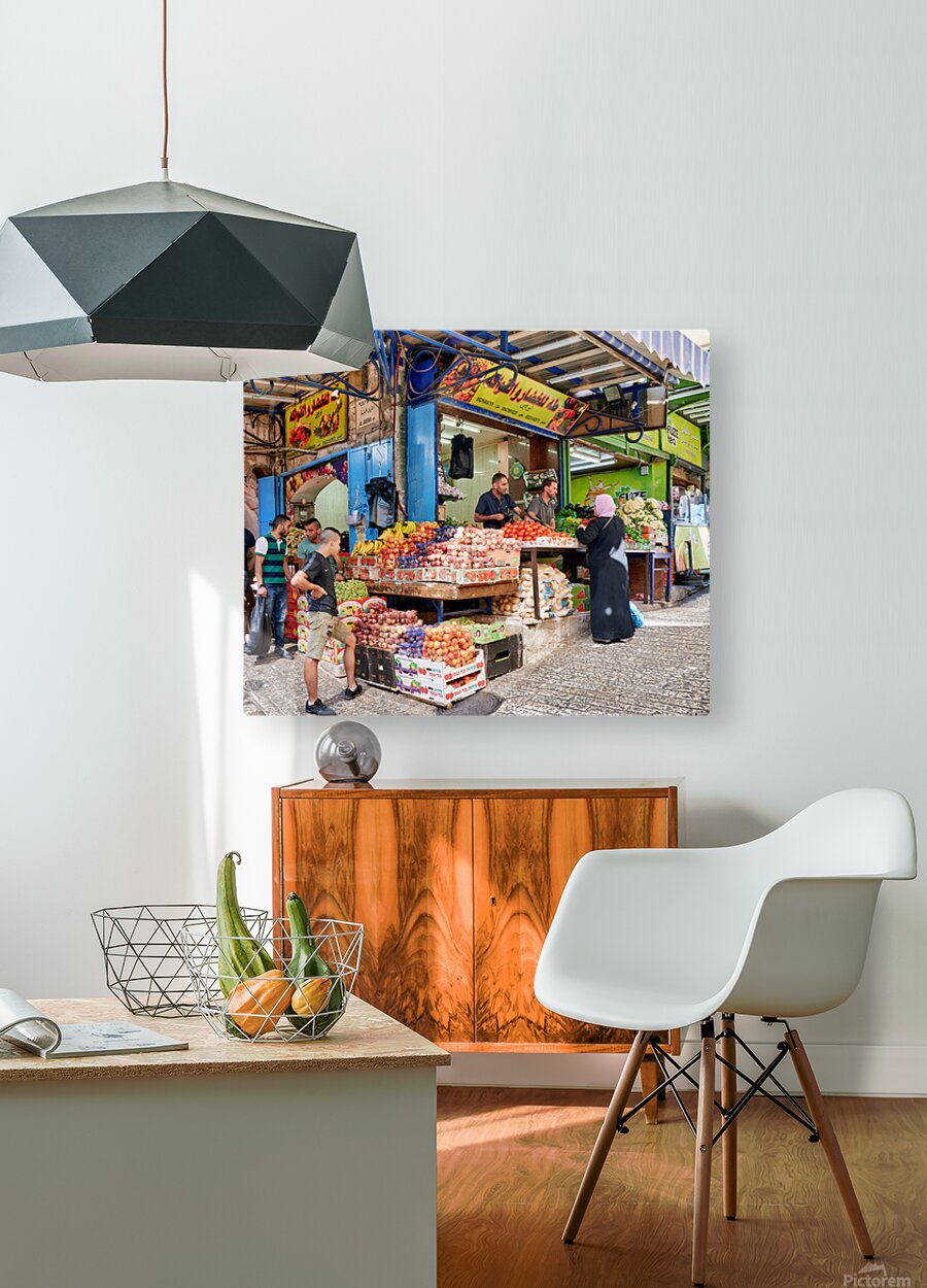 Greengrocer stall in the old city of Jerusalem busy with shopper Wood print
