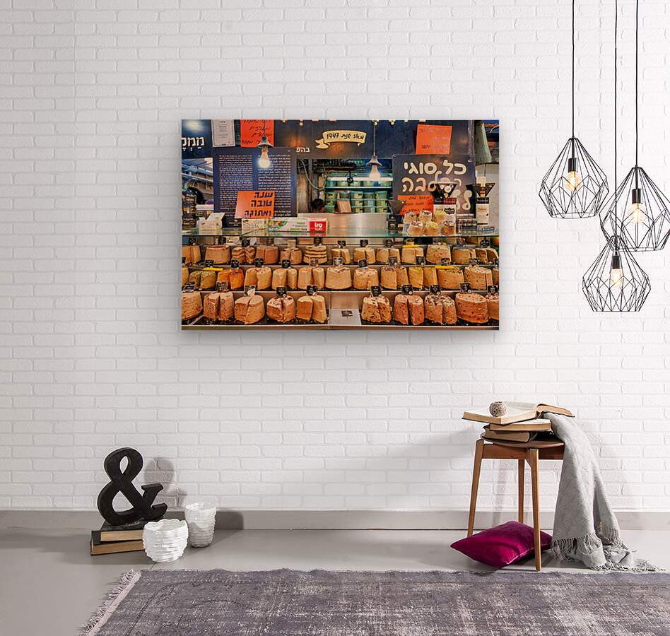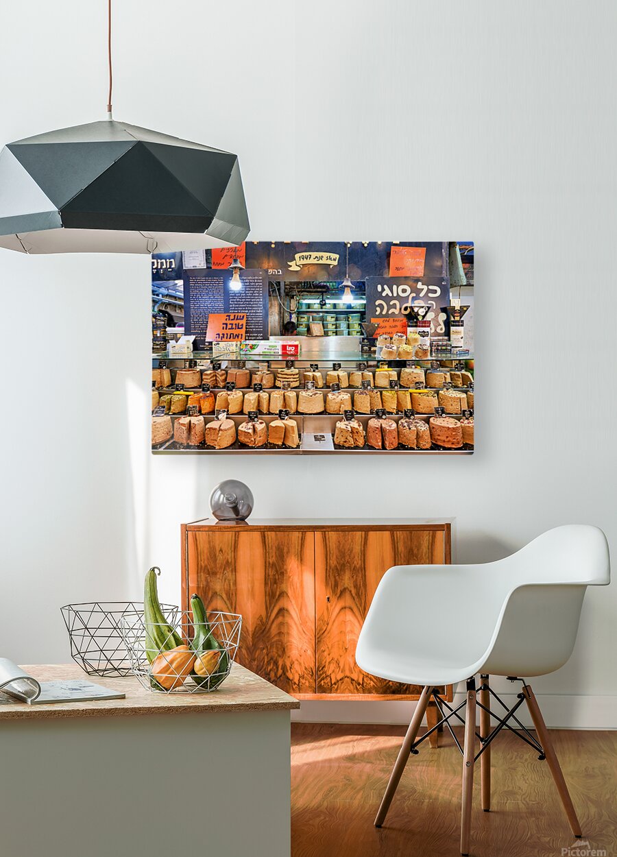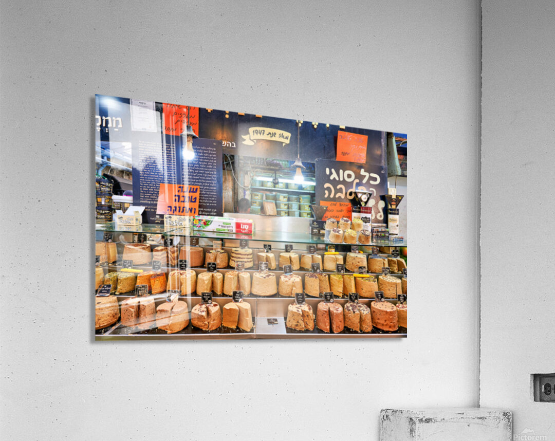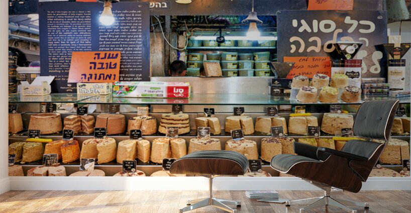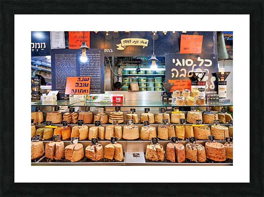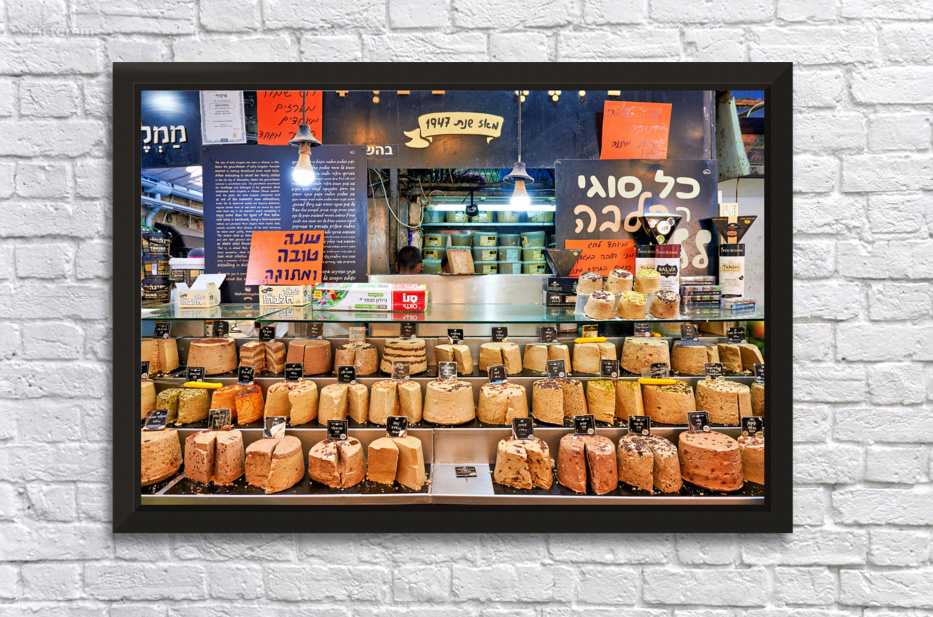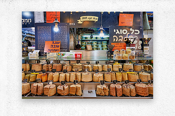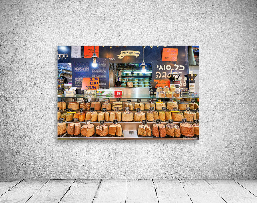 Cheese wheels are arranged neatly on shelves at Mahane Yehuda Market. Customers shop for fresh food during a busy day.