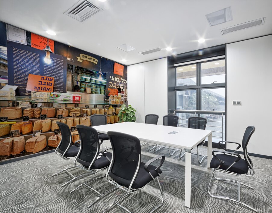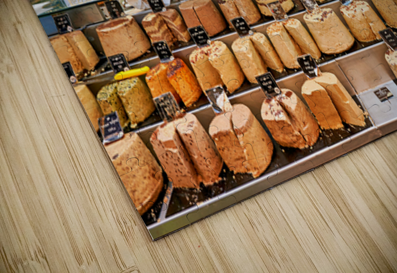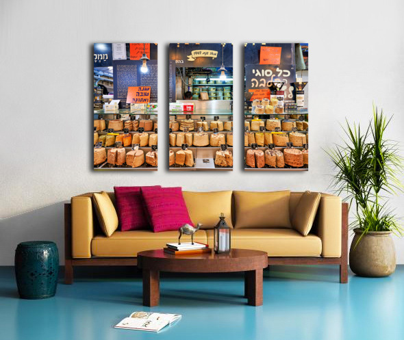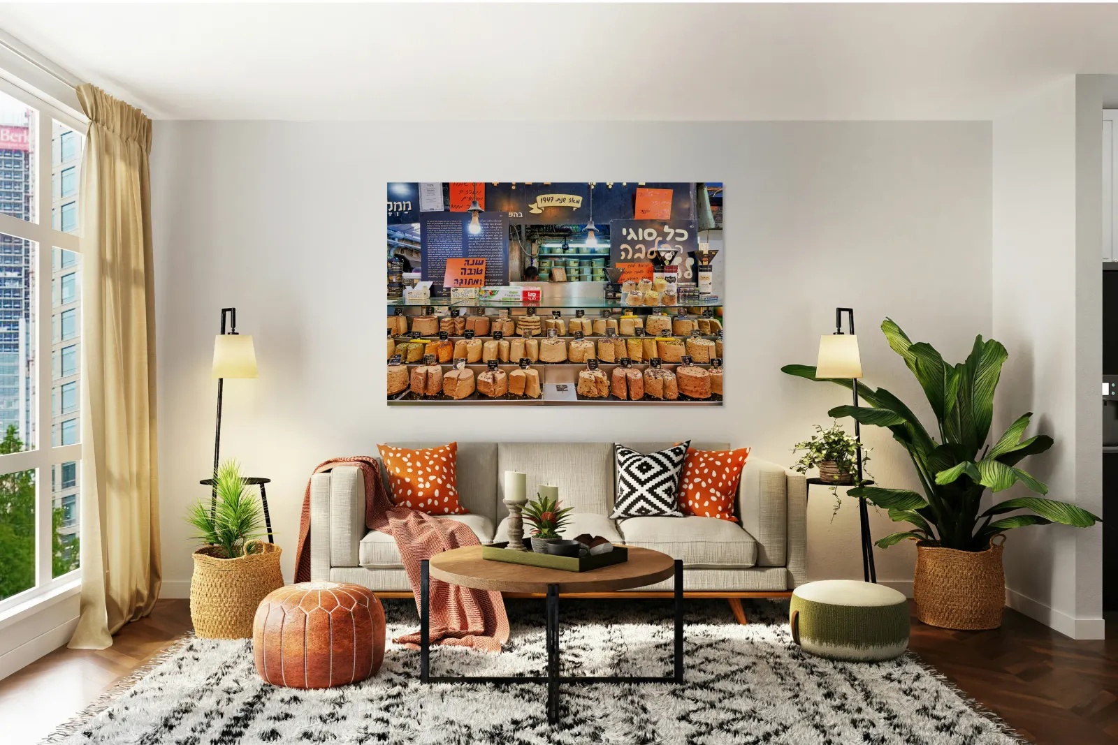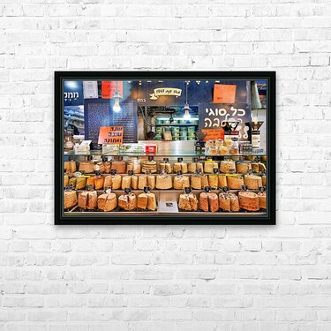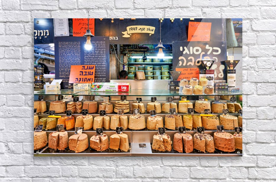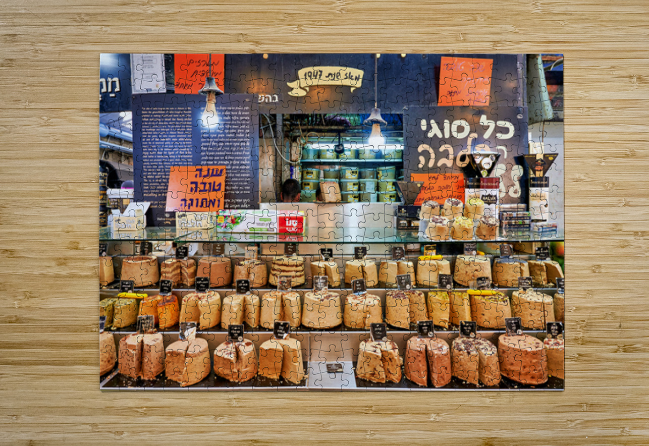 Cheese wheels are arranged neatly on shelves at Mahane Yehuda Market. Customers shop for fresh food during a busy day.