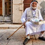 OLD MAN SITS IN THE OLD CITY OF JERUSALEM ASKING FOR HELP