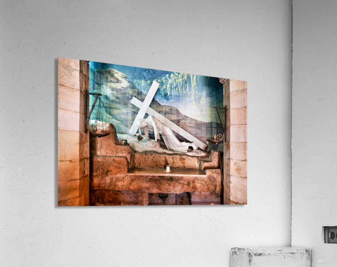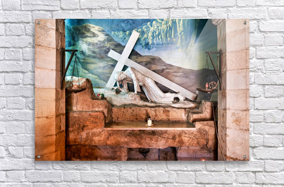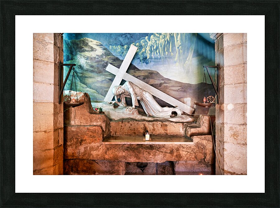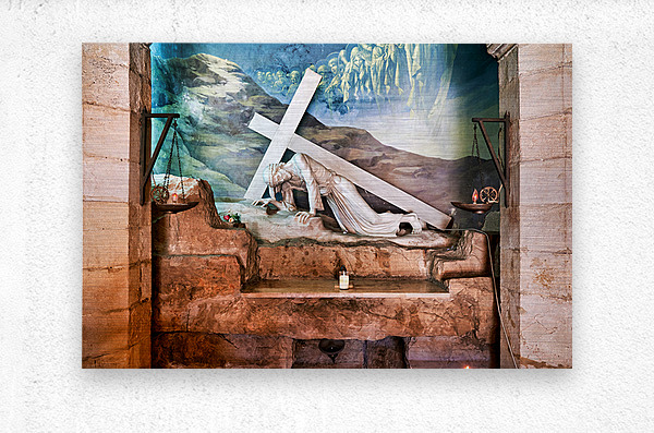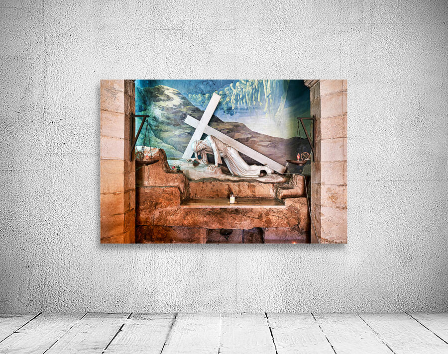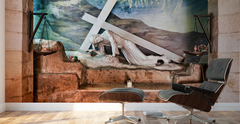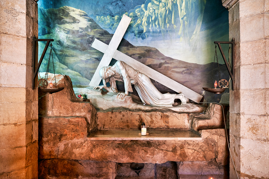 Inside the Church of St. Mary of Agony in Jerusalem a sculpture depicts a figure kneeling with a large cross in the background.