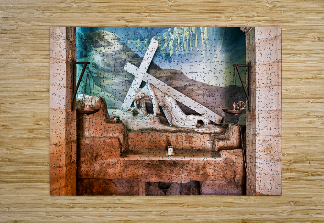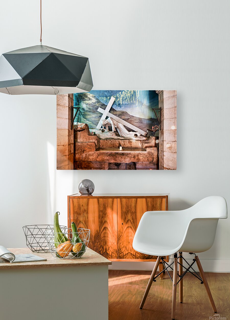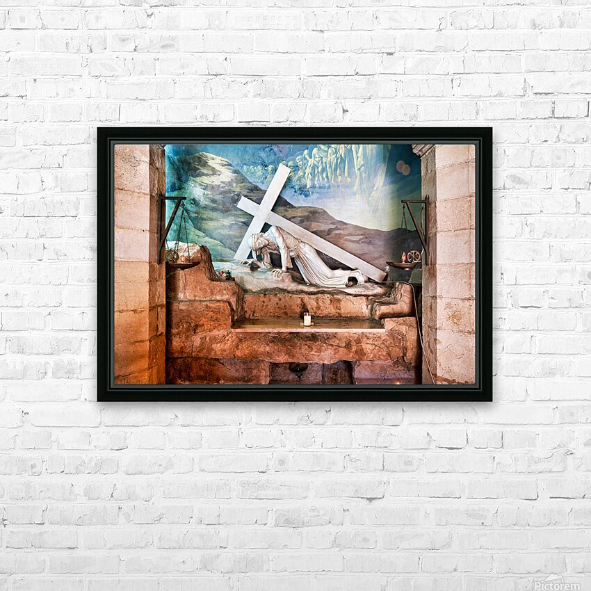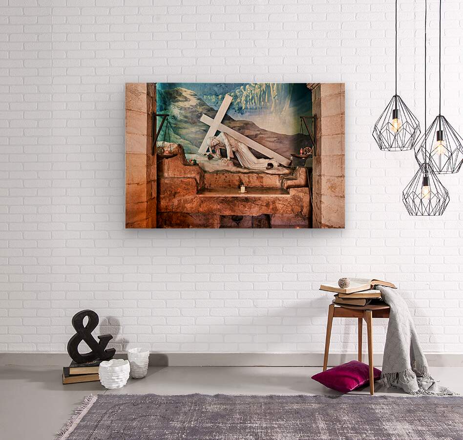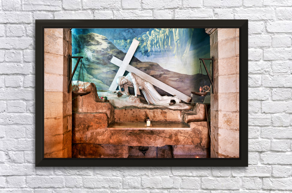 Inside the Church of St. Mary of Agony in Jerusalem a sculpture depicts a figure kneeling with a large cross in the background.