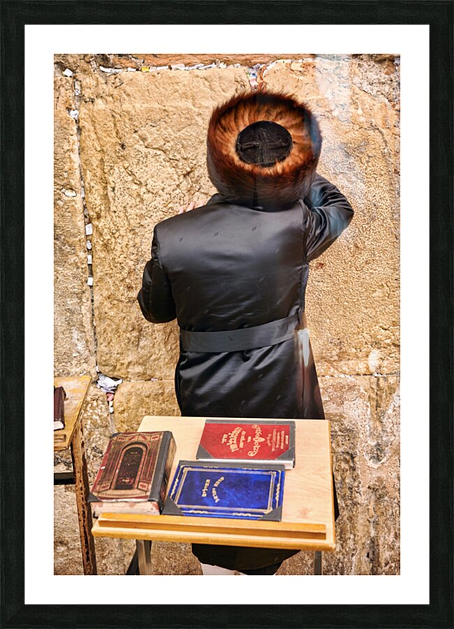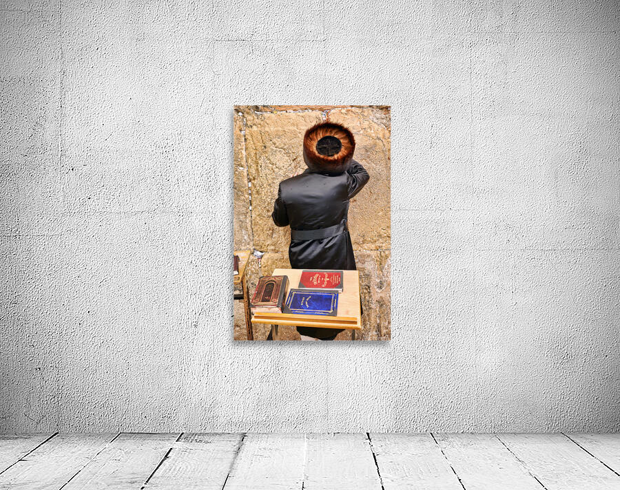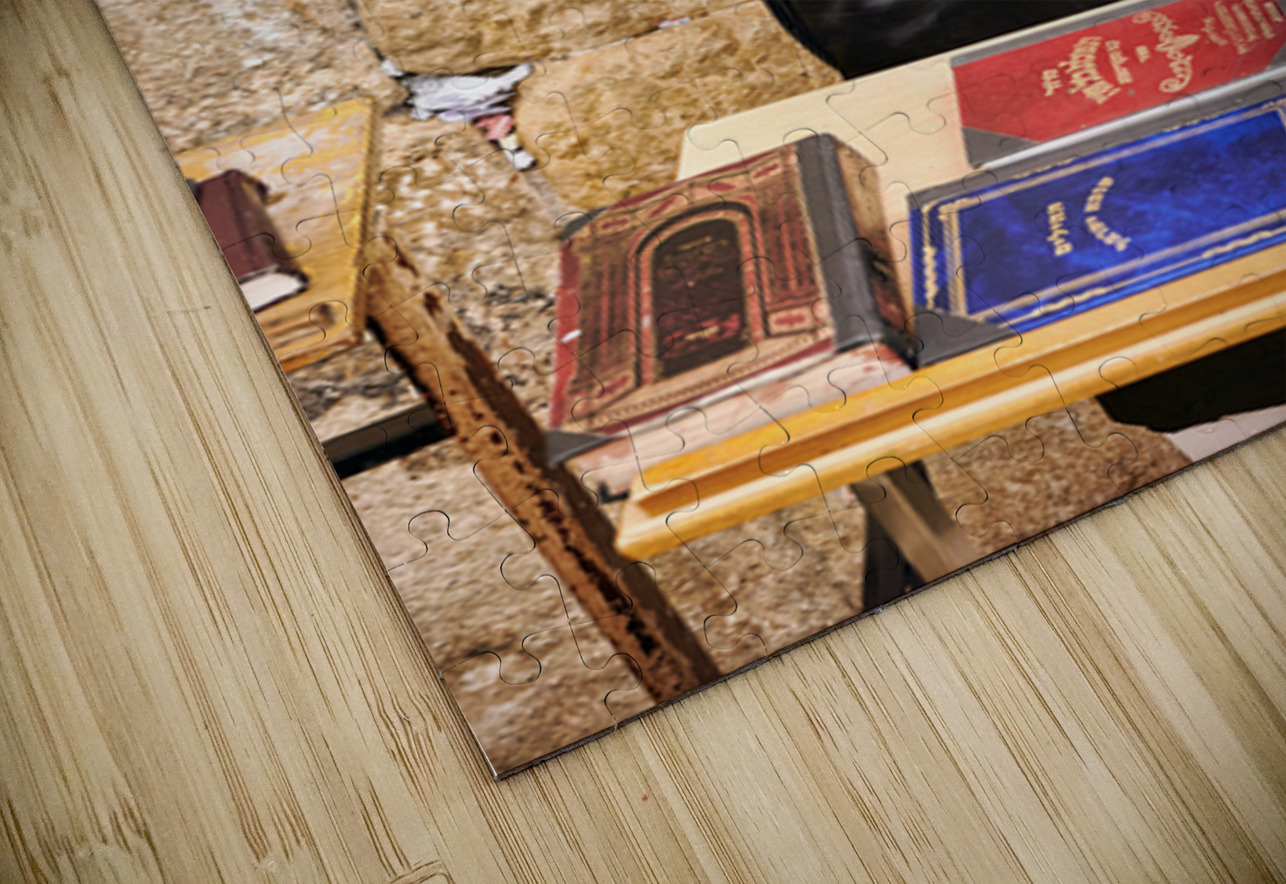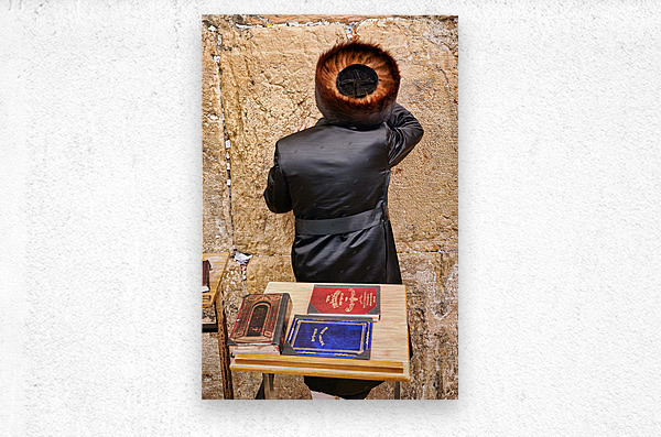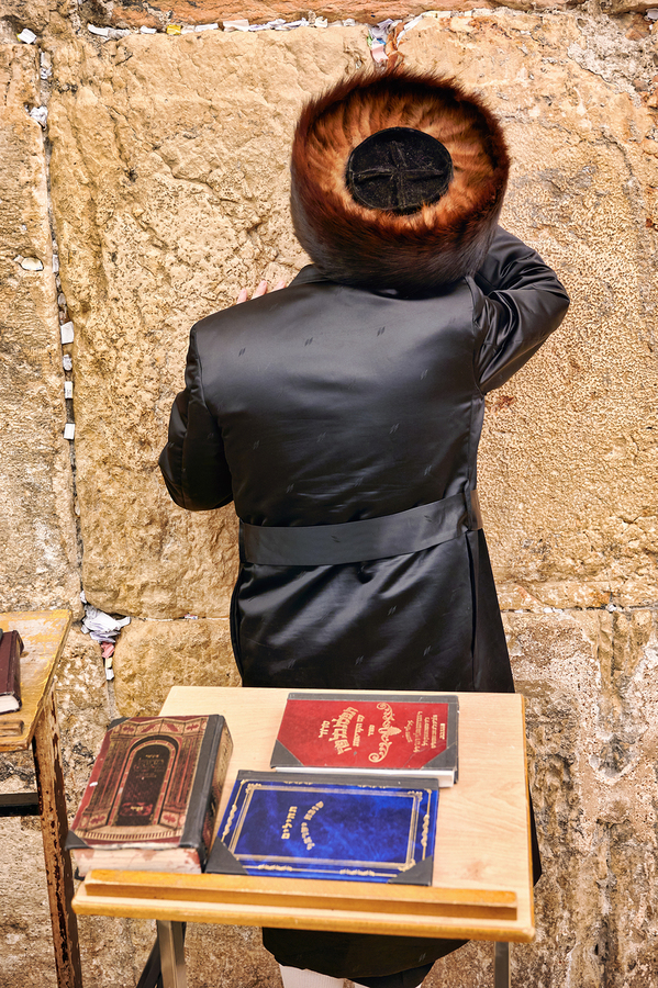 Orthodox Jews gather at the Western Wall in Jerusalem to pray and observe traditions. Books and prayer materials are present on the table.
