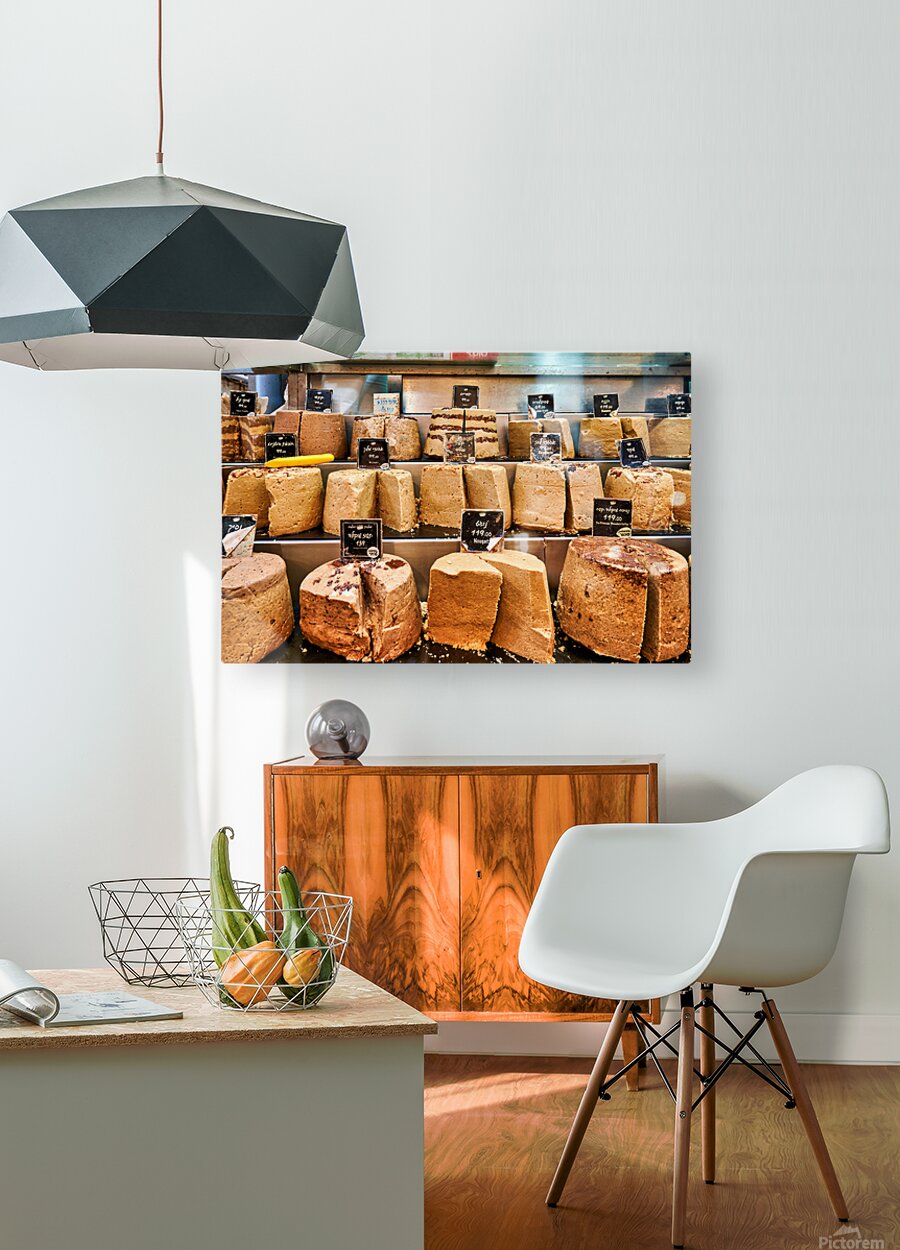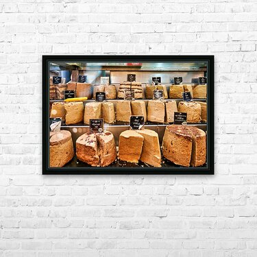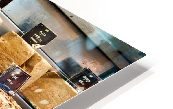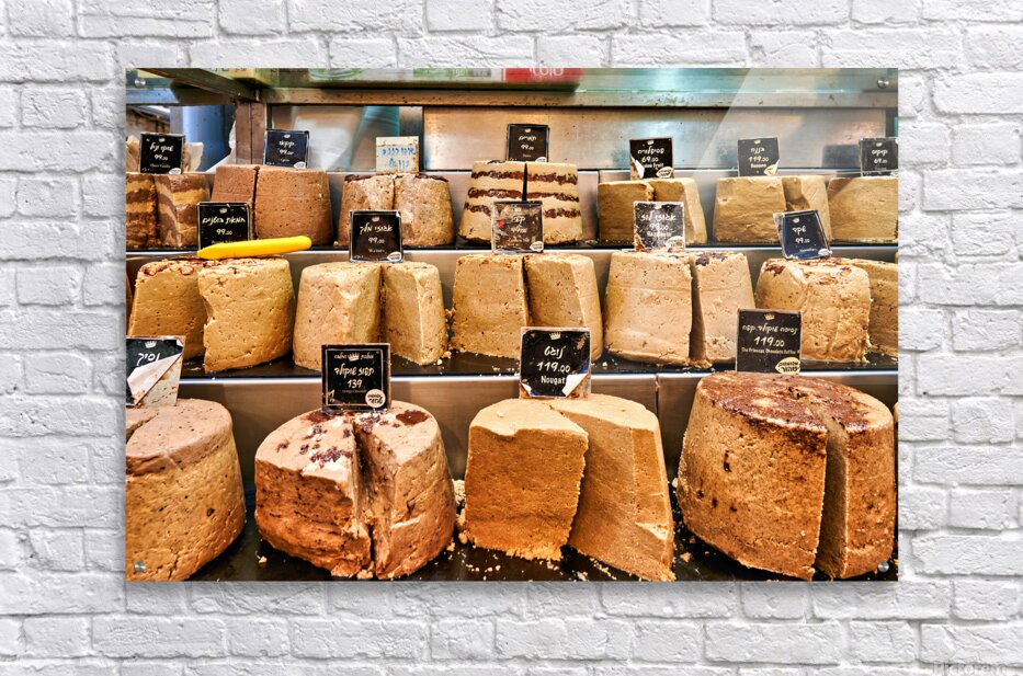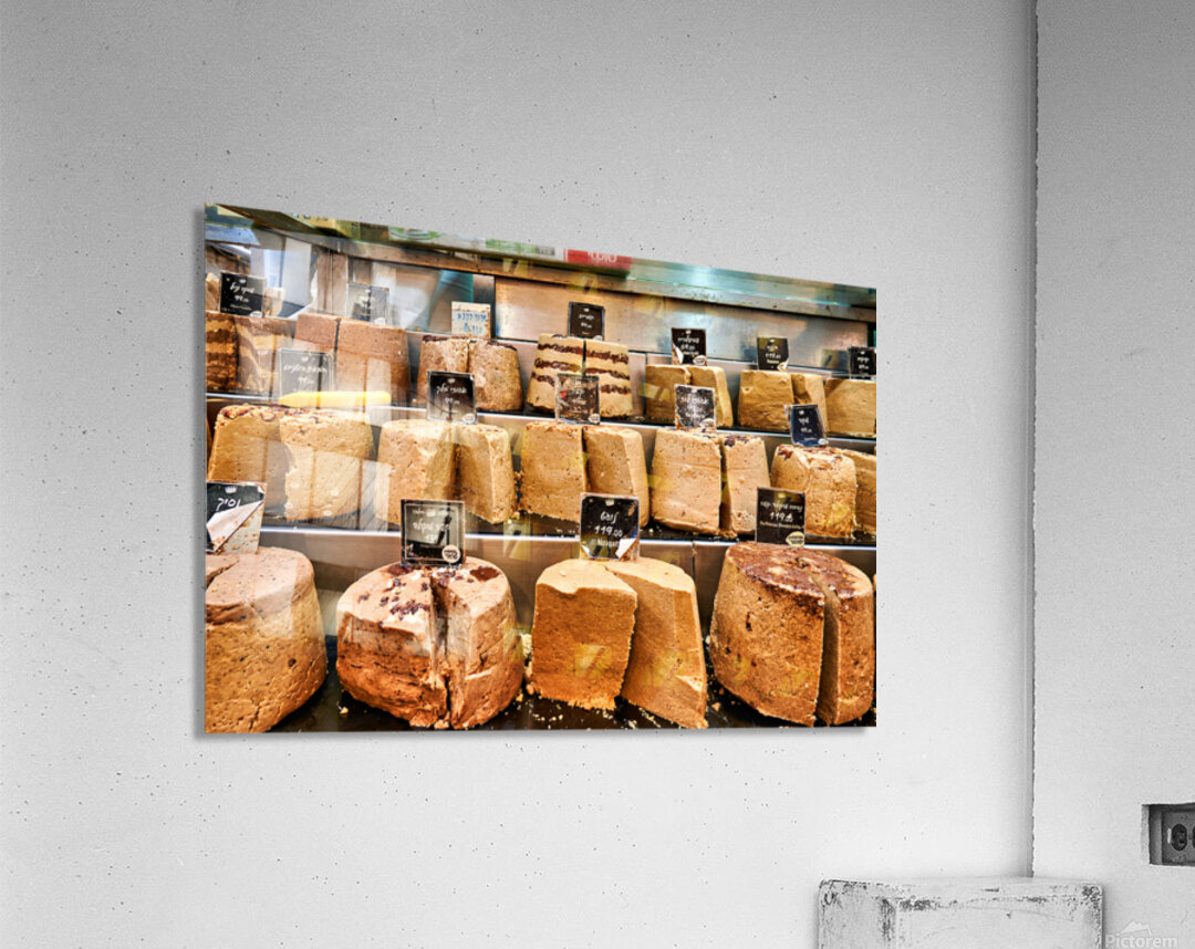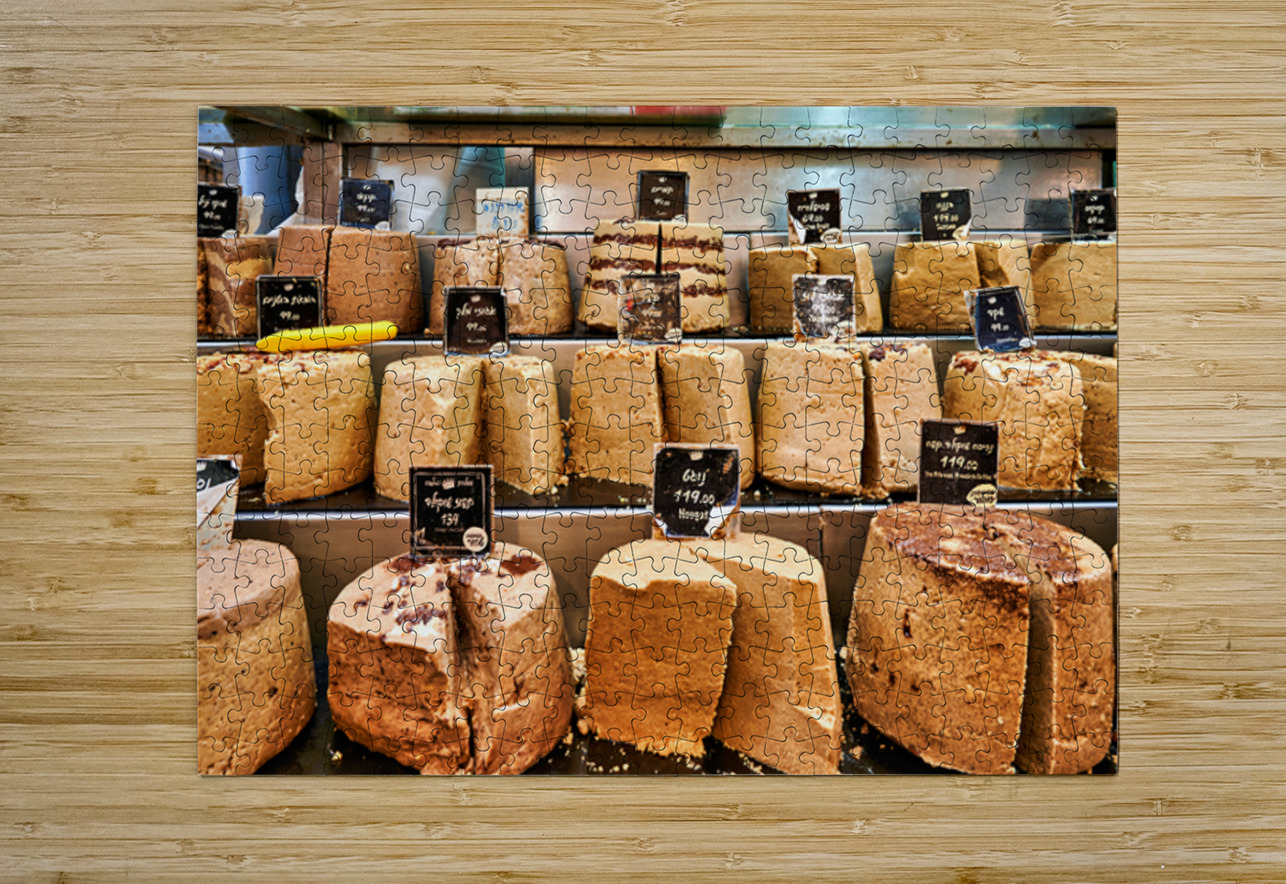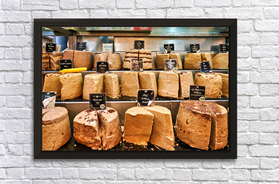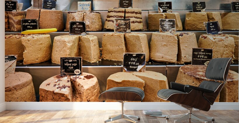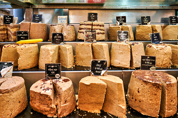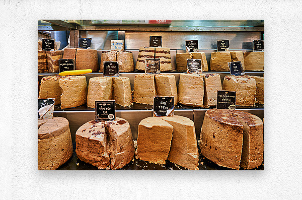 Different types of cheese are arranged for sale at Mahane Yehuda Market in Jerusalem. Customers browse the offerings during a busy market day.