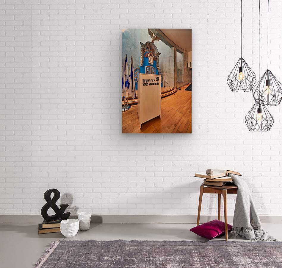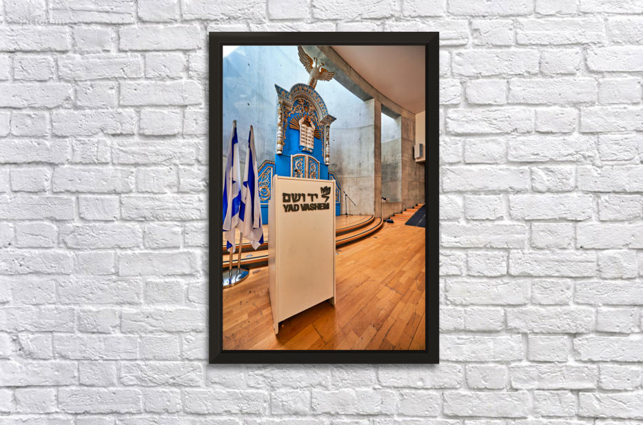 Inside the memorial synagogue at Yad Vashem in Jerusalem flags stand by the stage where events honor Holocaust victims.