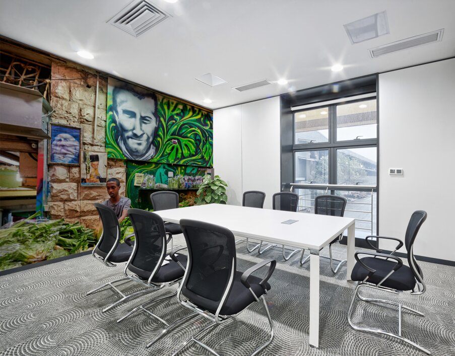 A vendor arranges vegetables in Mahane Yehuda Market Jerusalem. Colorful murals decorate the walls showcasing local art and culture.