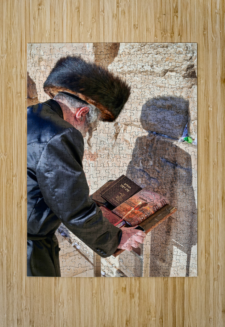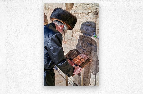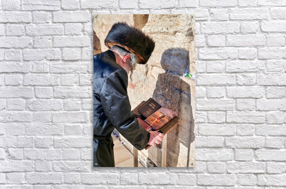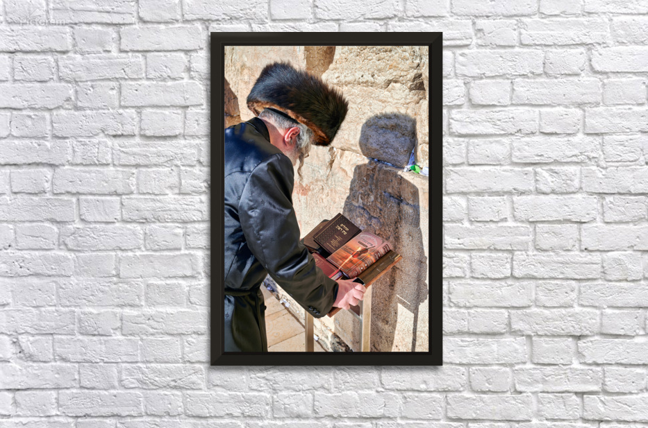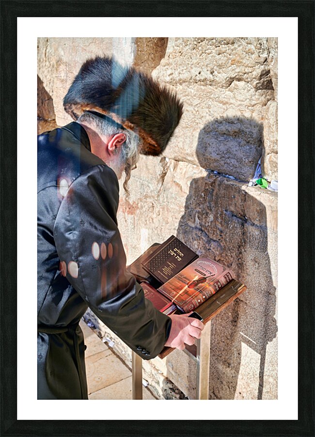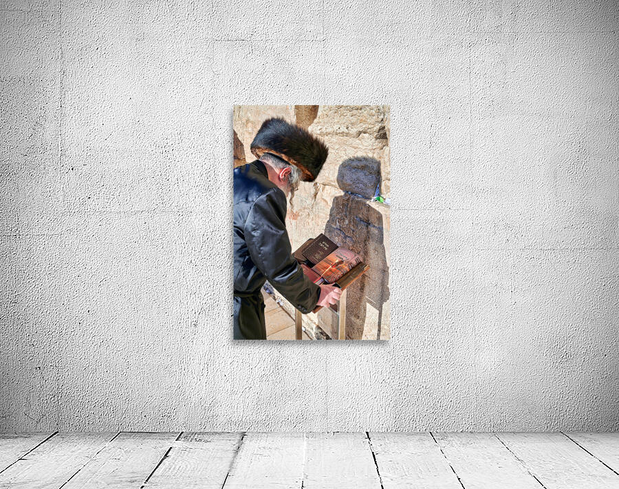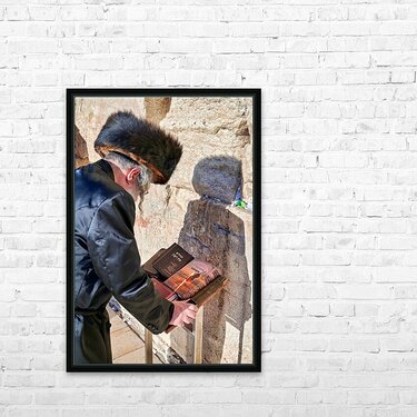 Orthodox Jews are praying at the Western Wall in Jerusalem. They focus on their prayers and hold their sacred texts while standing by the wall.