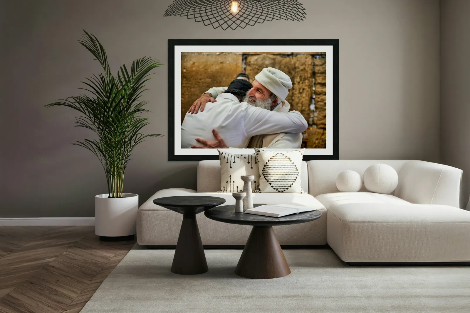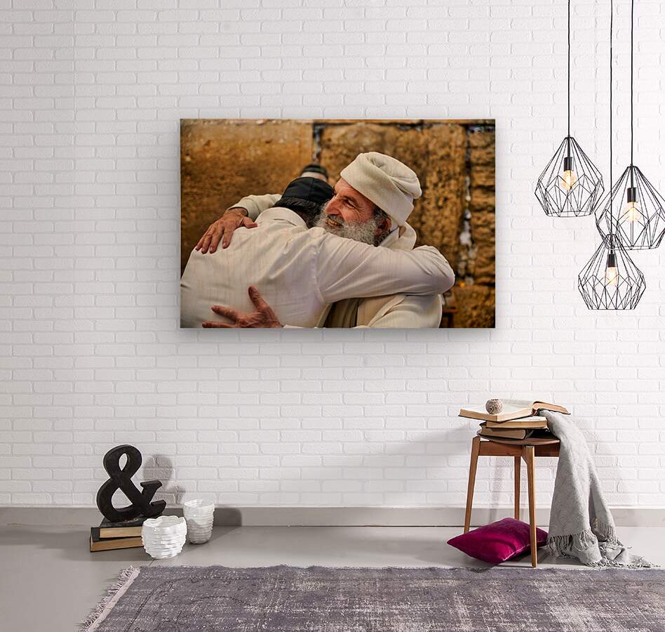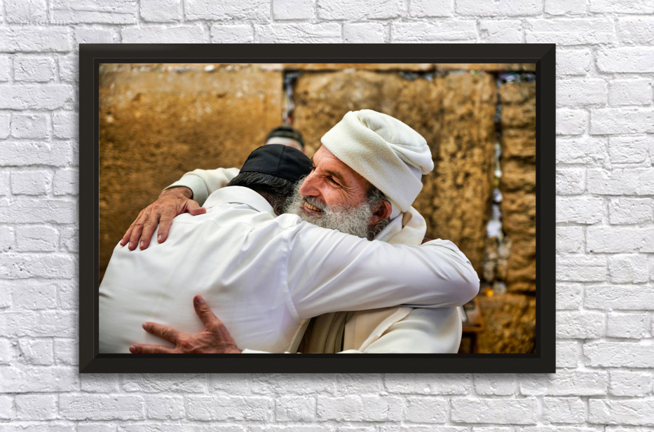"Men embrace each other at the Wailing Wall in Jerusalem" in a framed print.