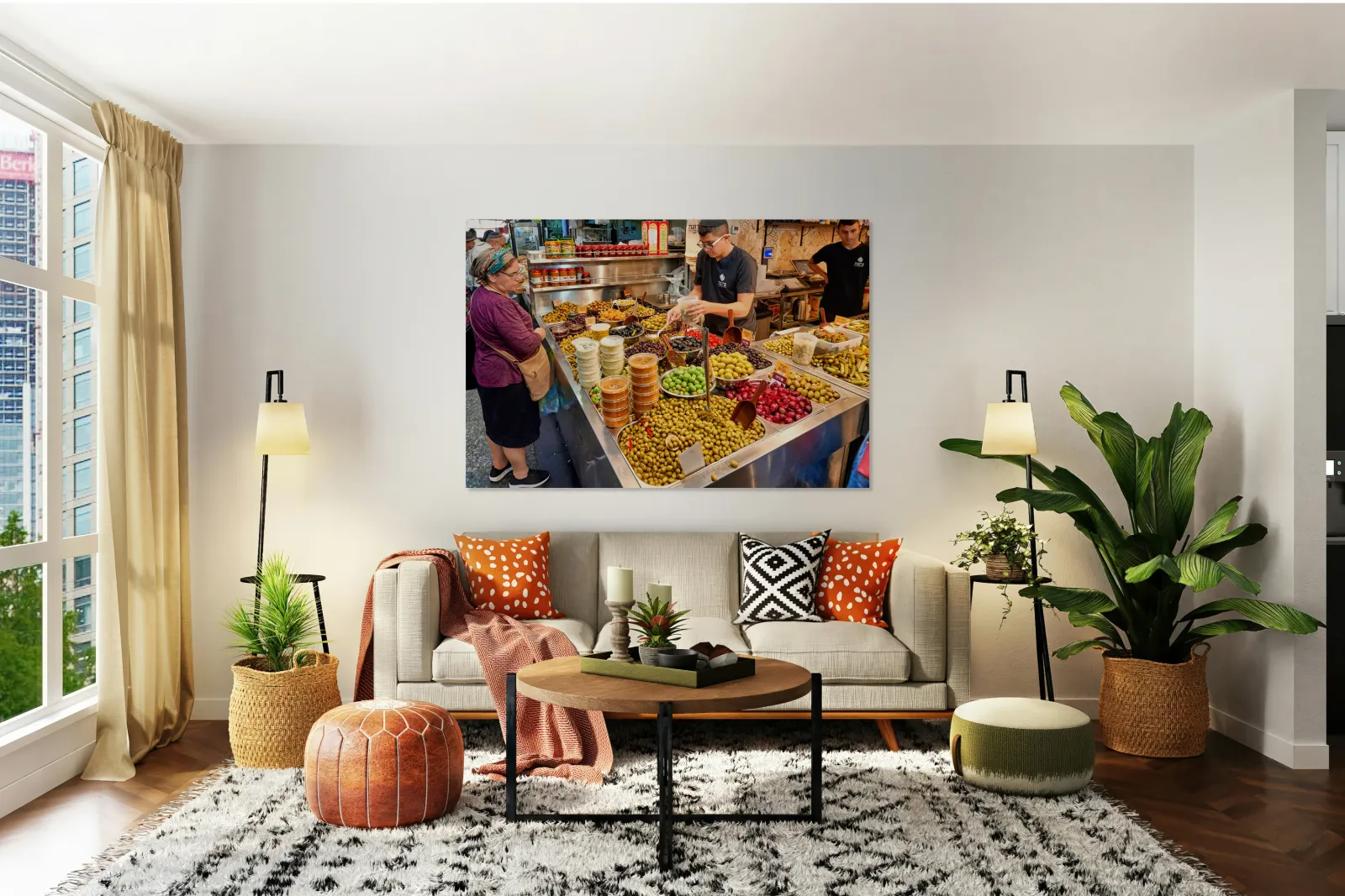 Visitors browse fresh olives and local foods at Mahane Yehuda Market in Jerusalem. Sellers offer a variety of olives and snacks to customers.