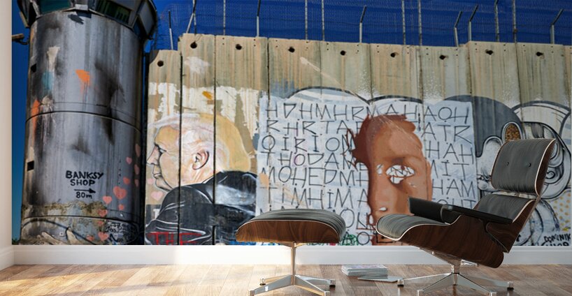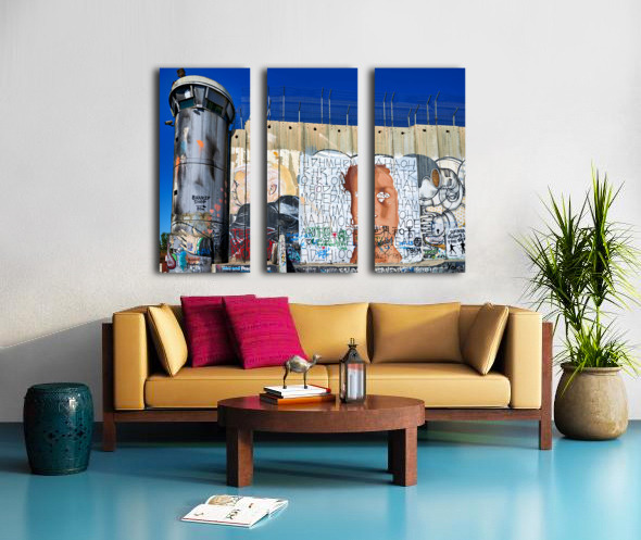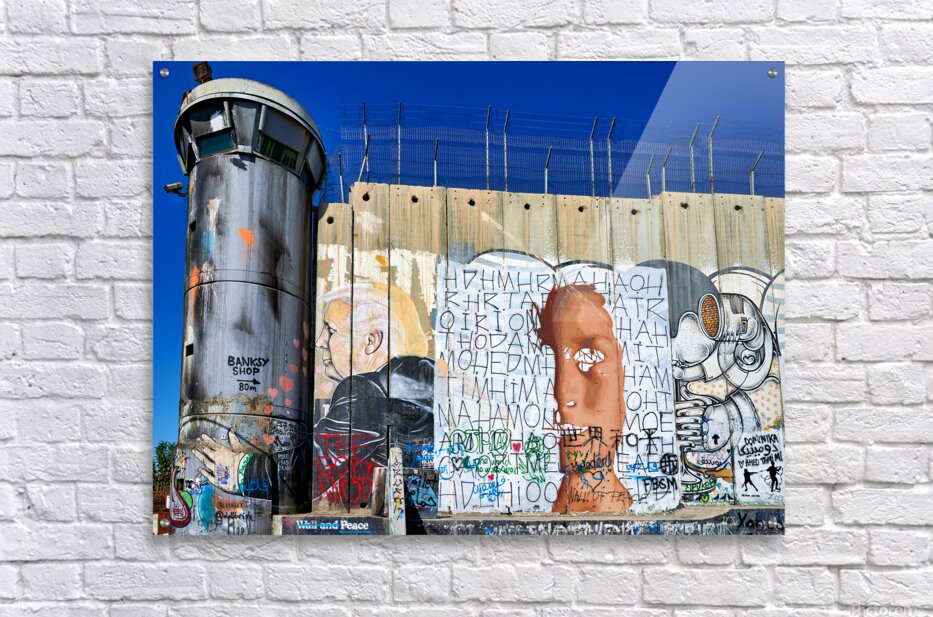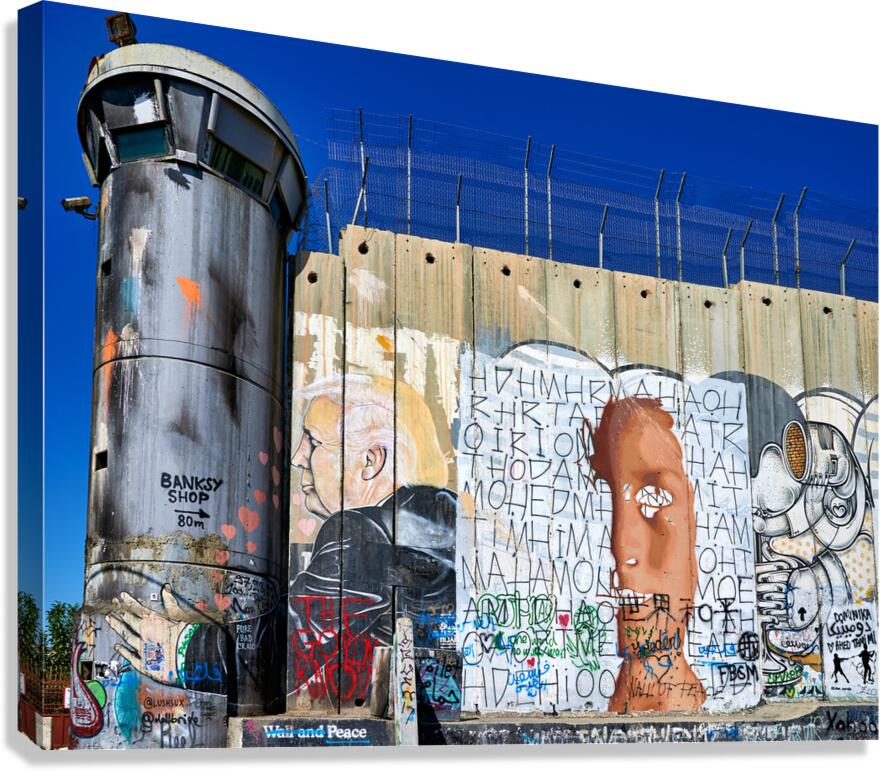 Get this artwork "Wall and artwork near a guard tower in Bethlehem Jerusalem" in a framed print.