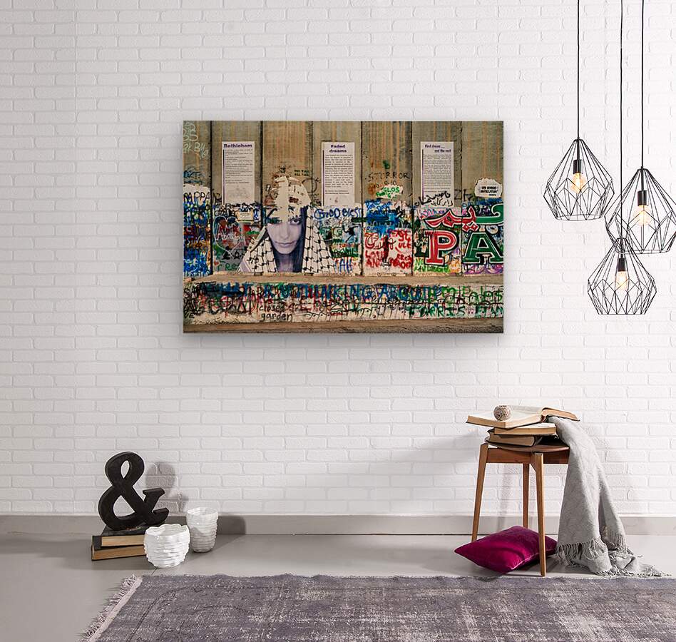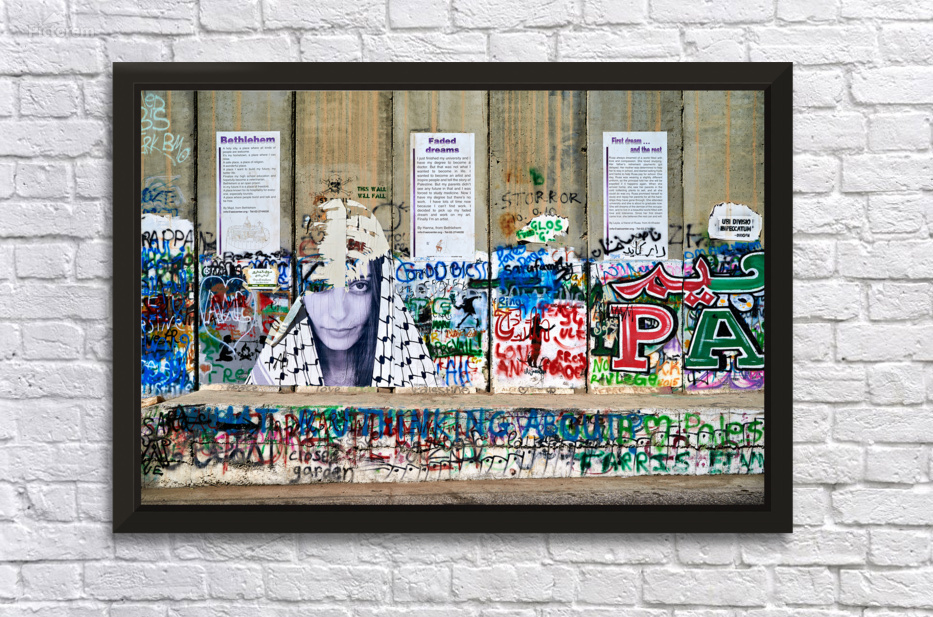 The west bank separation wall in Bethlehem shows colorful graffiti and art. There are messages and images painted on the wall by local artists.
