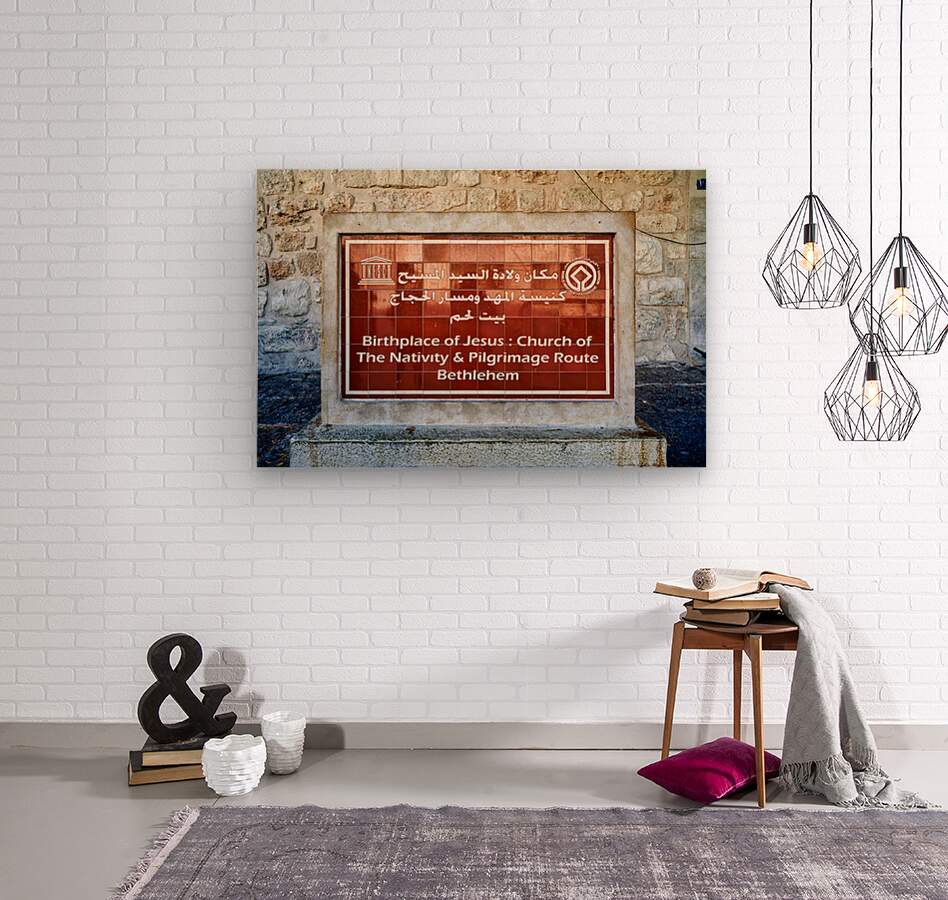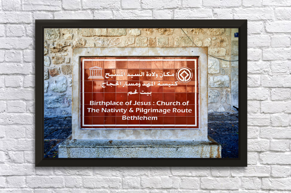 A sign marks the Church of the Nativity in Bethlehem Israel. It lists the site as the birthplace of Jesus. This location is for pilgrims.