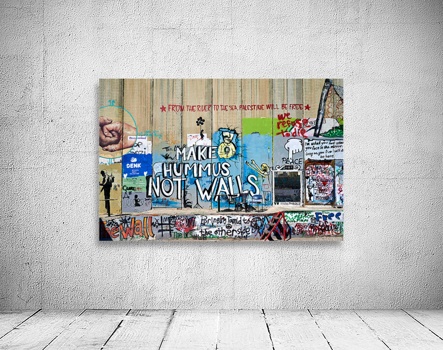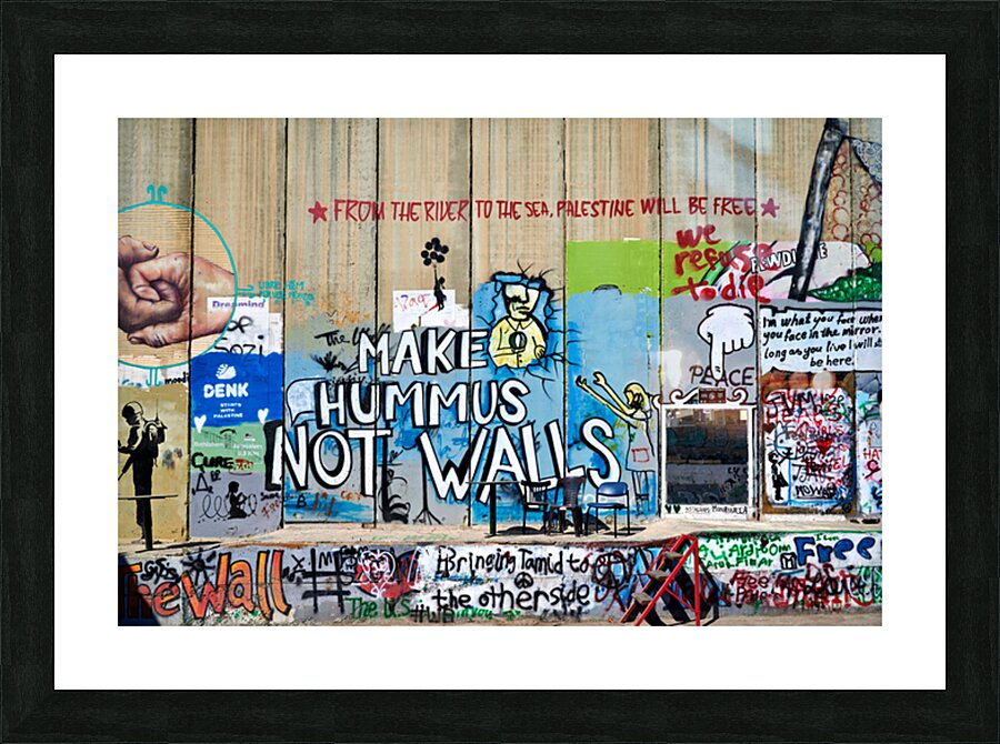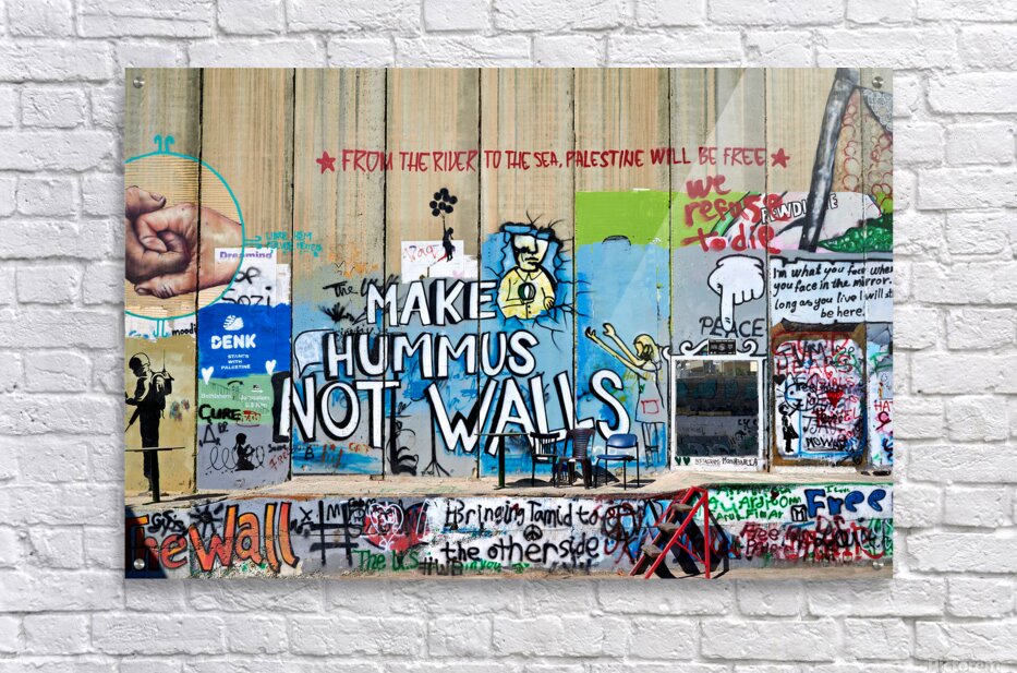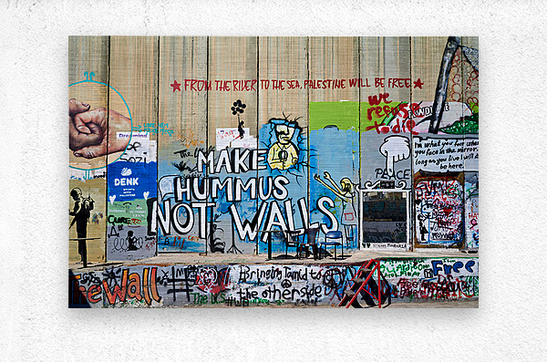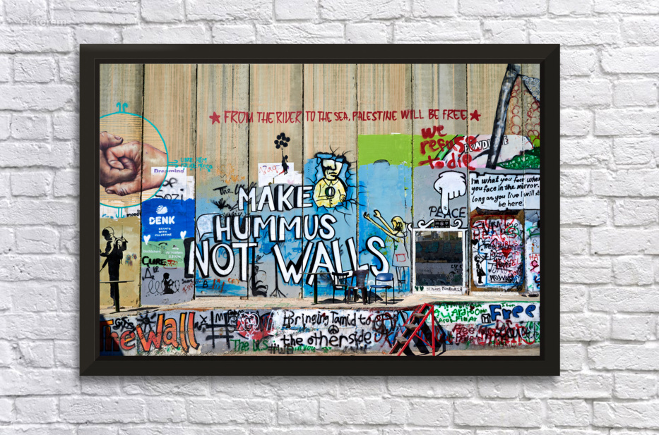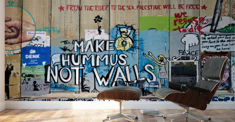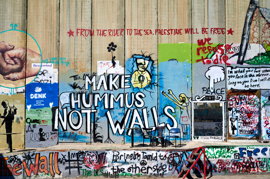 A mural with graffiti displays messages about freedom near the separation wall in Bethlehem showing artwork and slogans from the community.