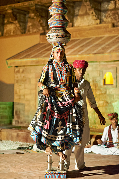 In Khimsar Rajasthan artists perform traditional dance while balancing pots. The show highlights the regions rich cultural heritage and art.