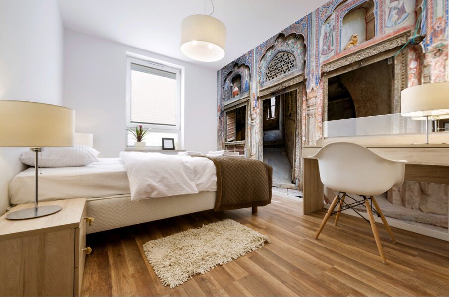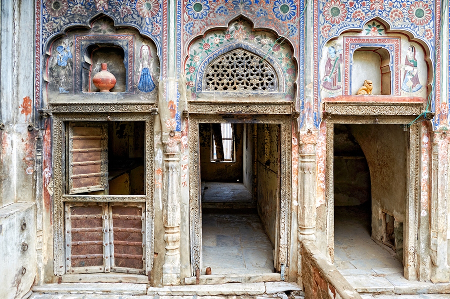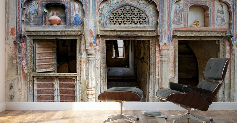 The traditional design of a house in Mandawa Rajasthan. The walls are decorated with patterns and colors typical of the region.