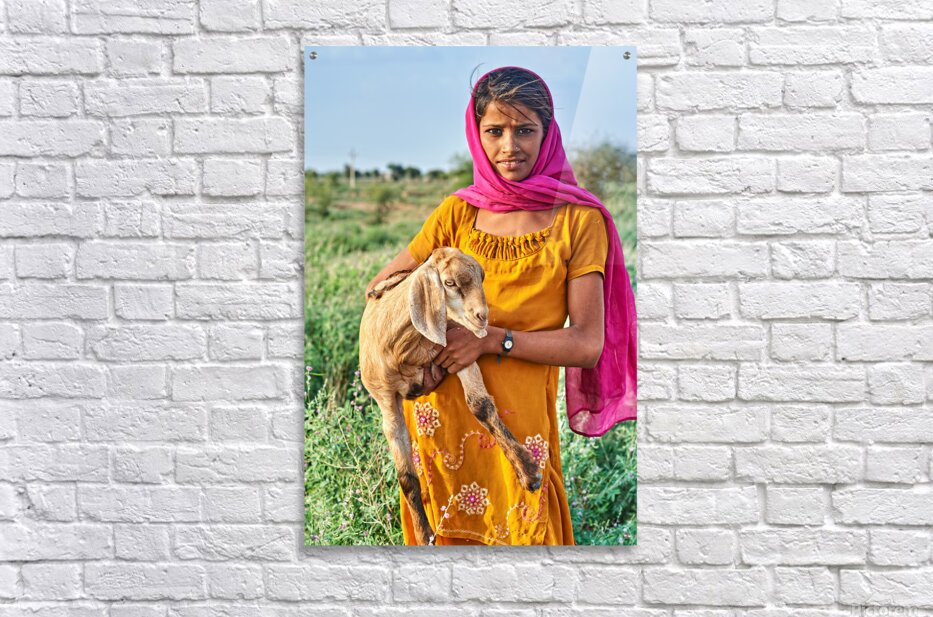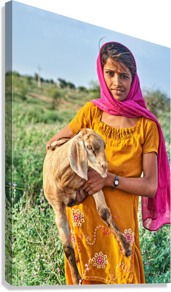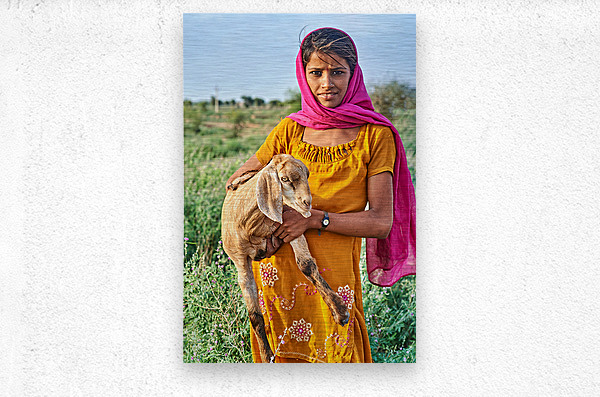ABOUT THIS ARTWORK: GIRL HOLDS GOAT IN KHIMSAR RAJASTHAN INDIA DURING SUNNY DAY