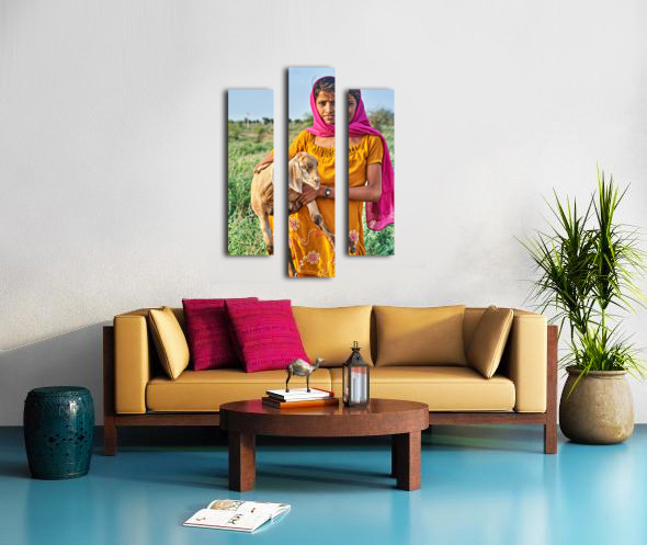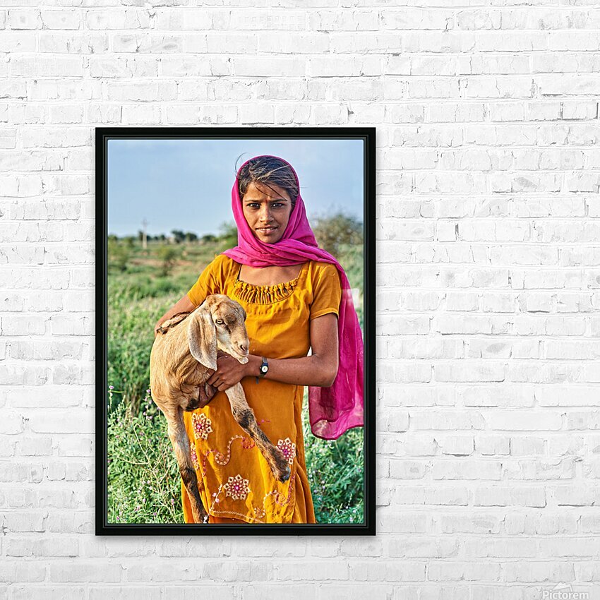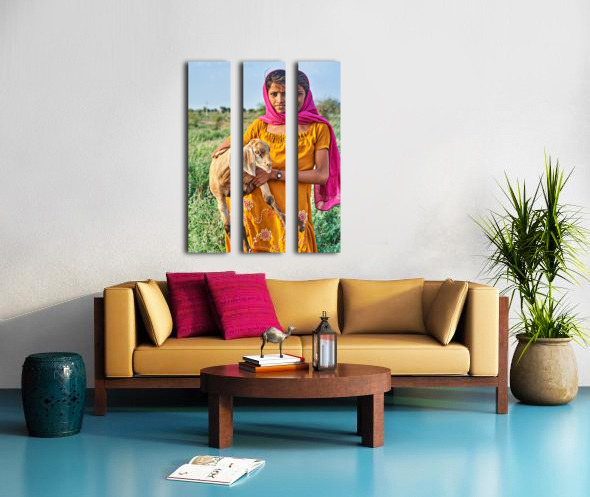 Get this artwork "Girl holds goat in Khimsar Rajasthan India during sunny day" in a framed print.