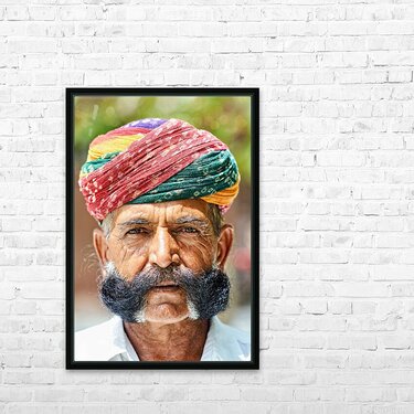 Senior man in colorful turban in Deshnok Rajasthan India Picture Frame Printing