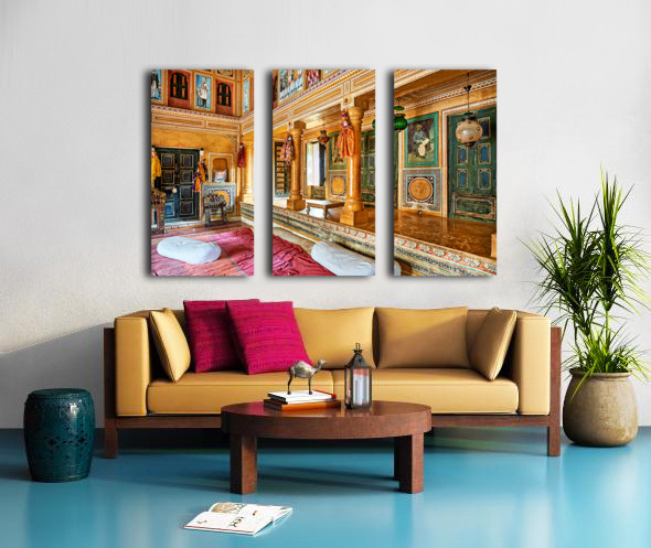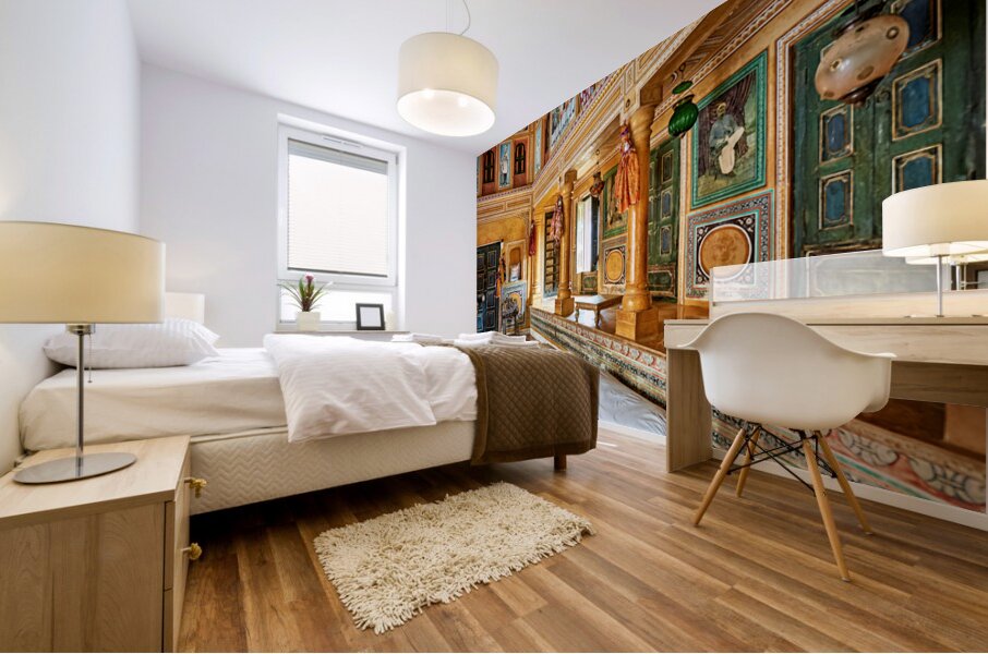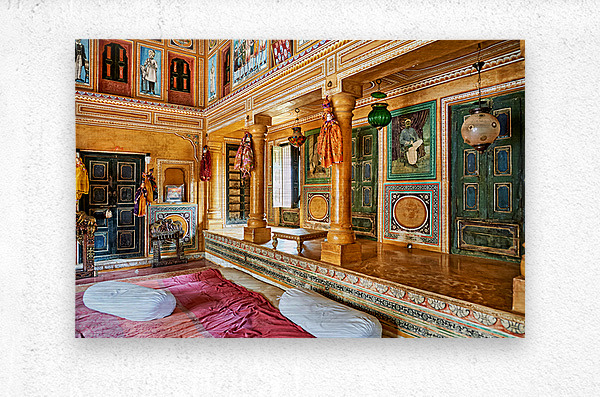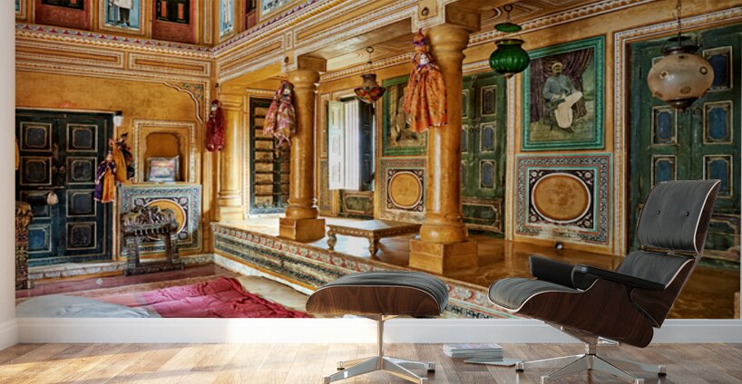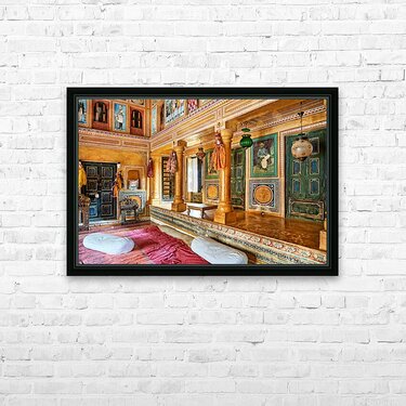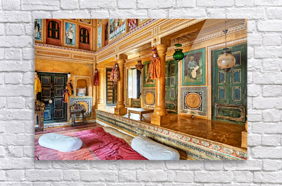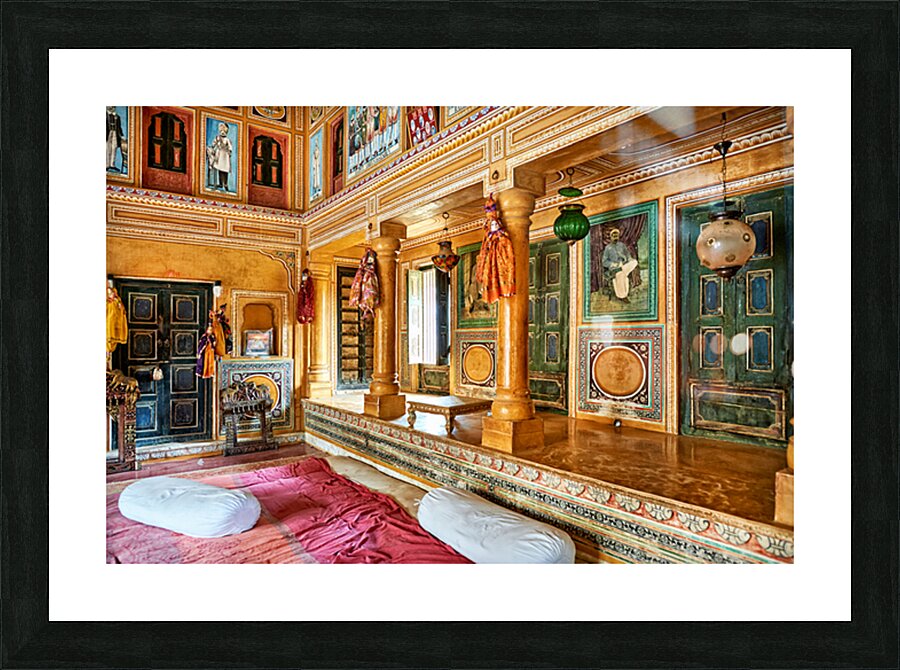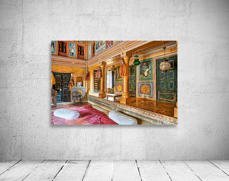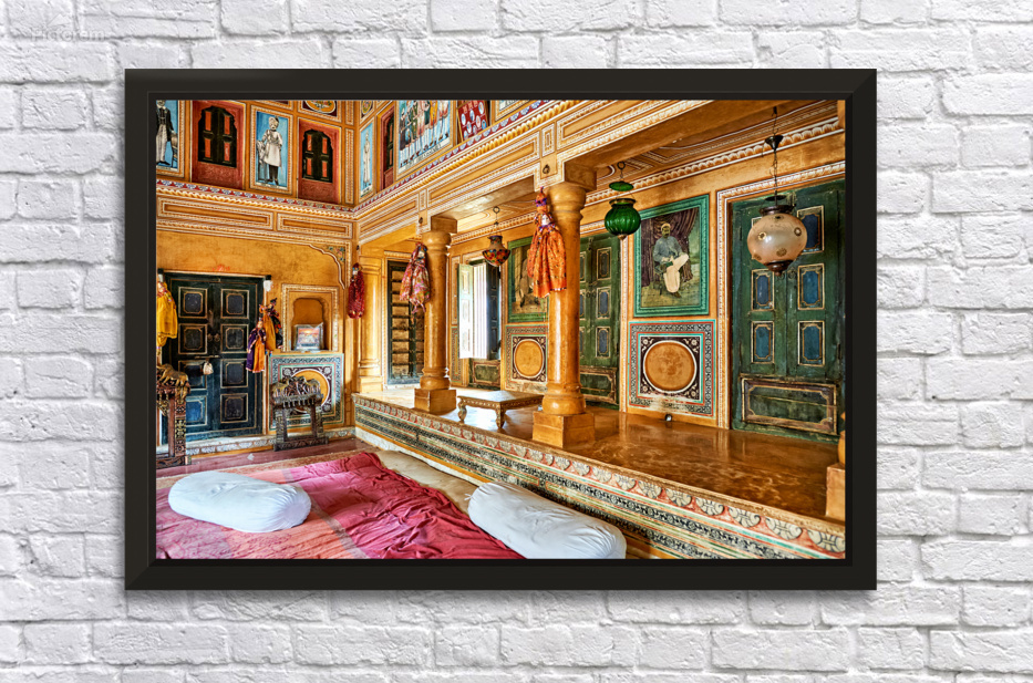 This is a view inside a traditional house in Mandawa Rajasthan. The space shows decorated walls pillars and seating areas for visitors.