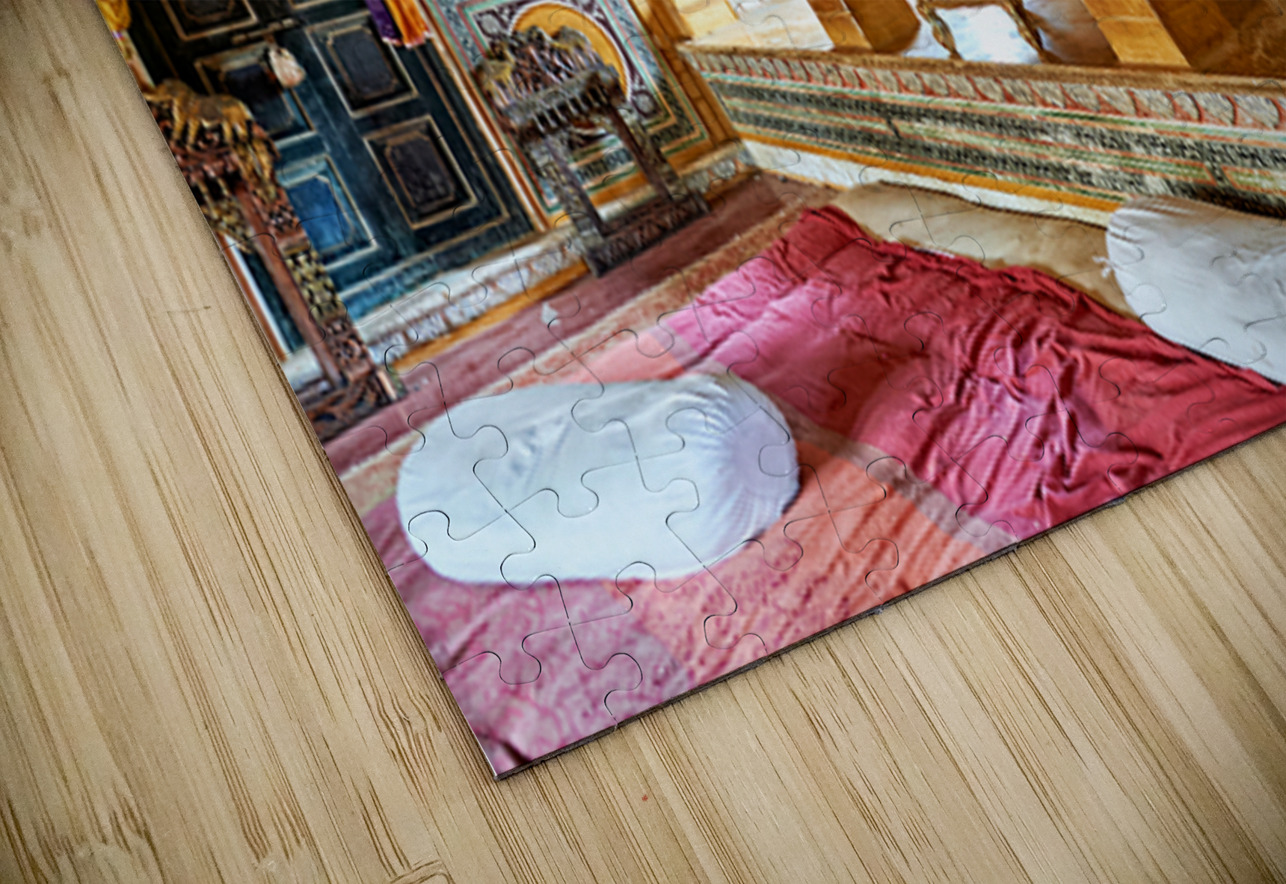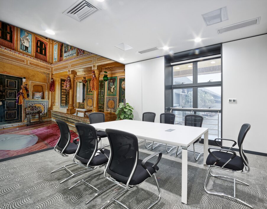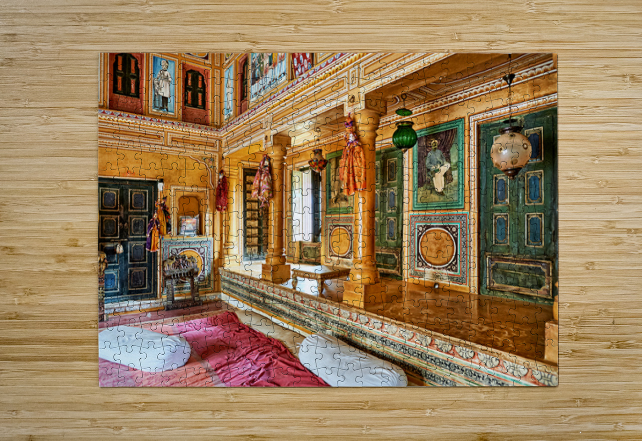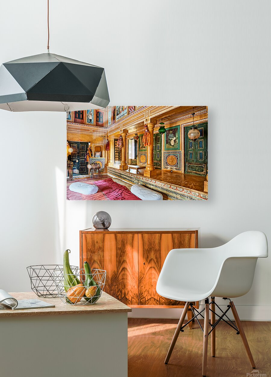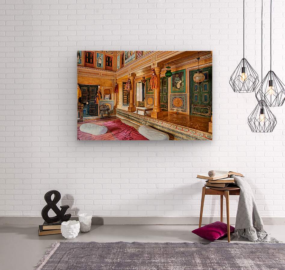 This is a view inside a traditional house in Mandawa Rajasthan. The space shows decorated walls pillars and seating areas for visitors.