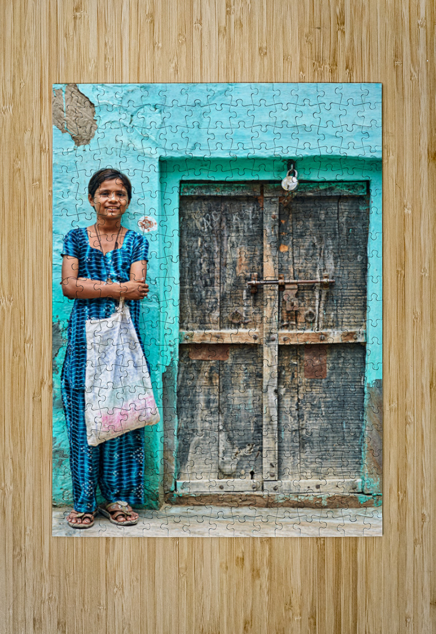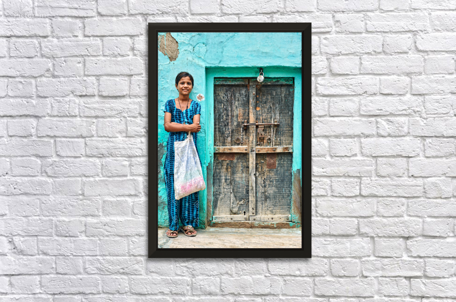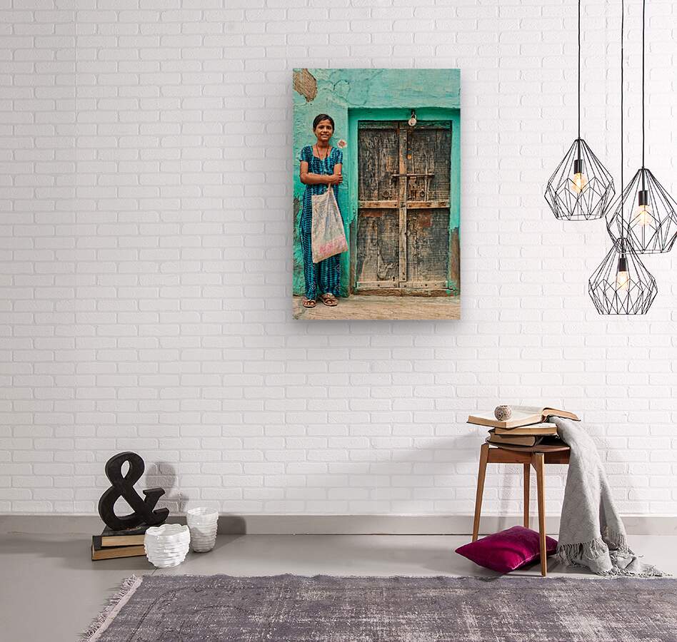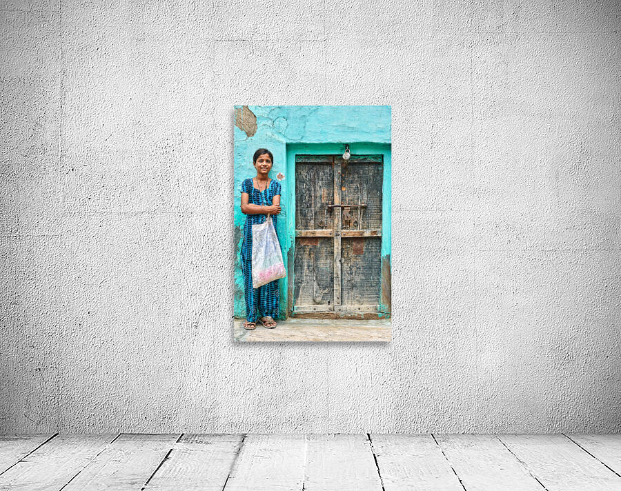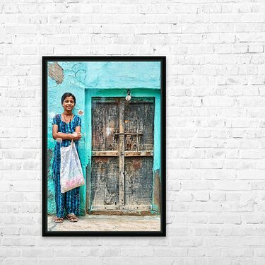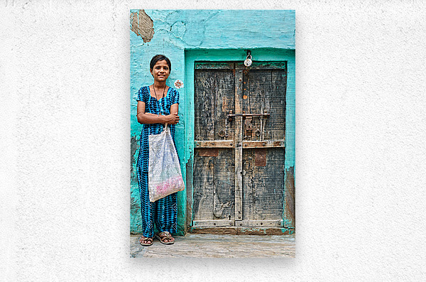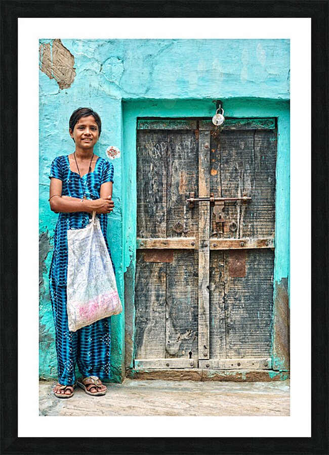 A girl stands in front of her wooden door in Mandawa India. She holds a bag and smiles while wearing a traditional dress.