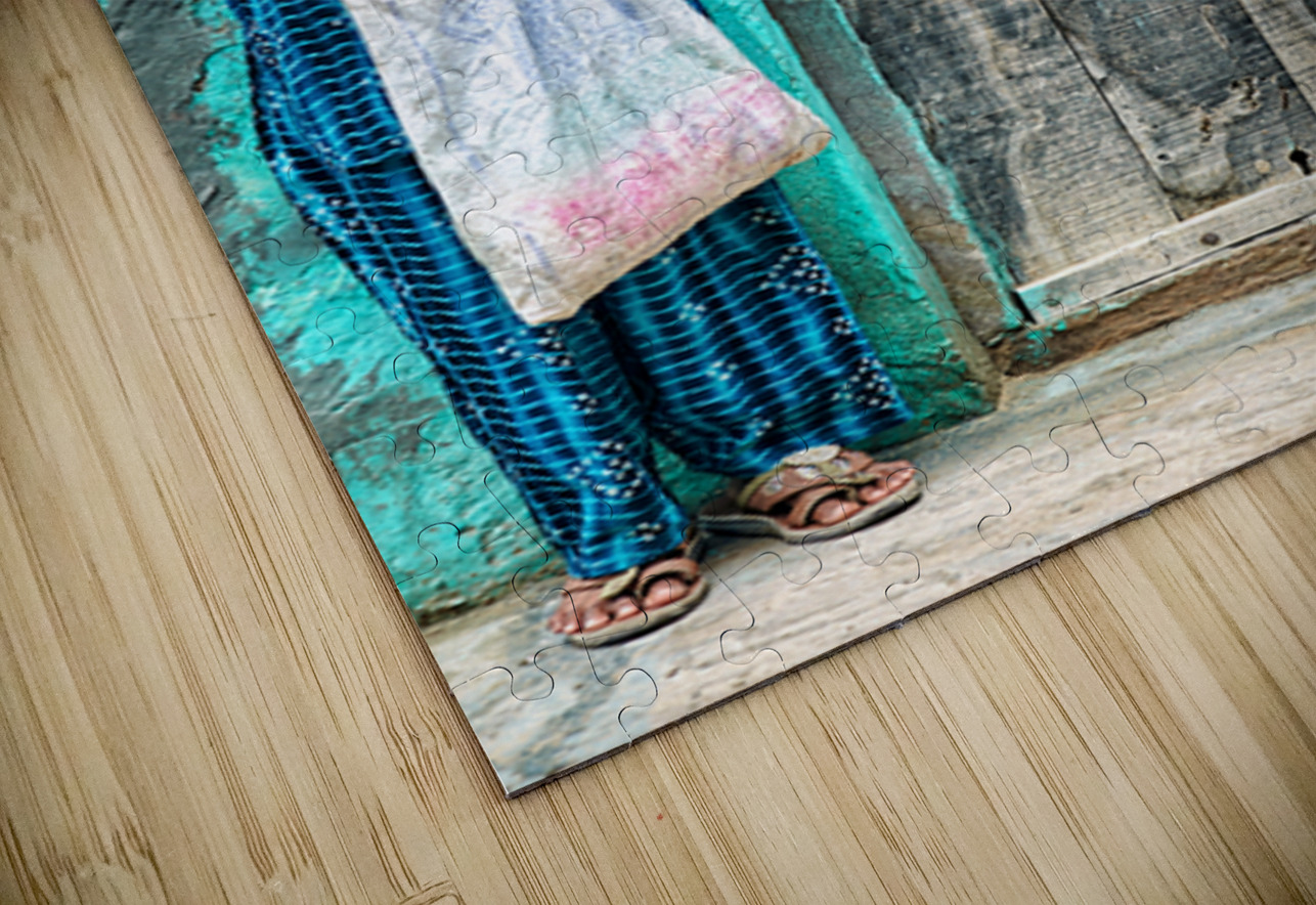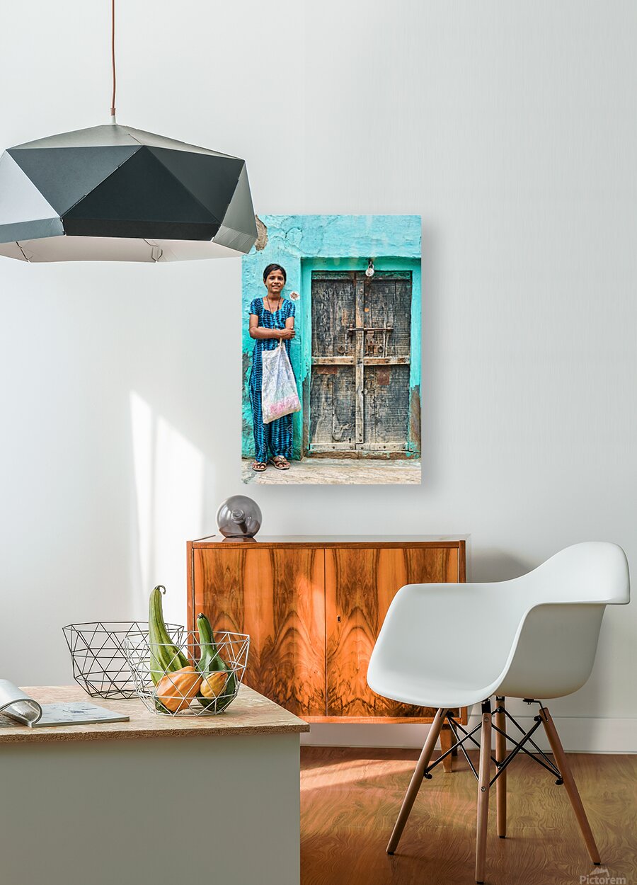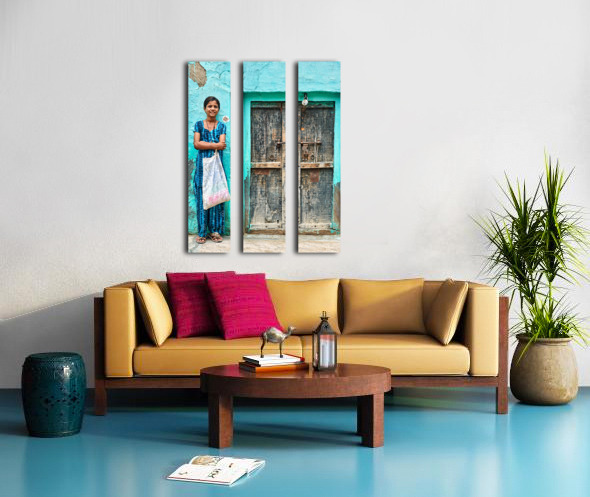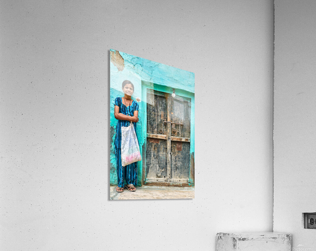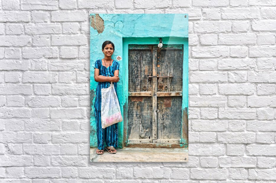 A girl stands in front of her wooden door in Mandawa India. She holds a bag and smiles while wearing a traditional dress.