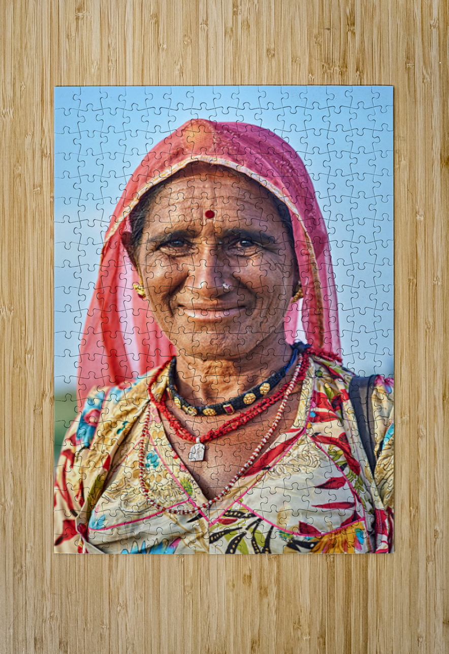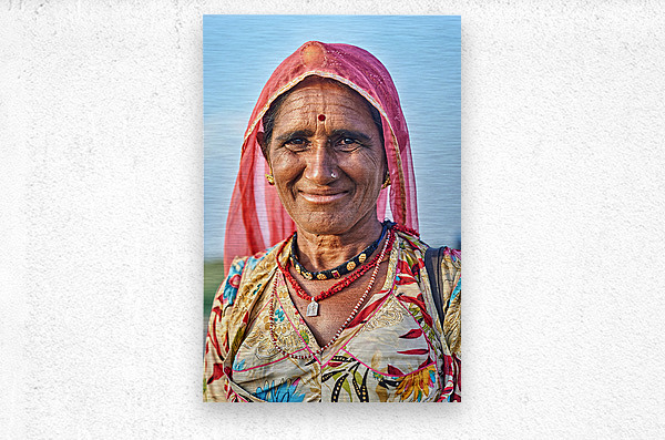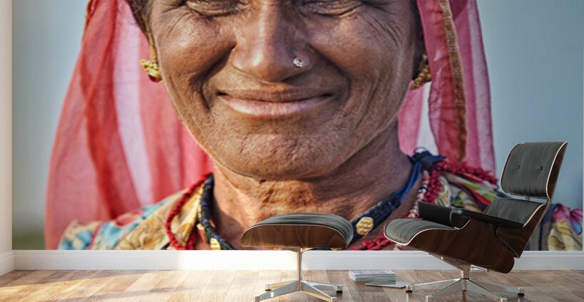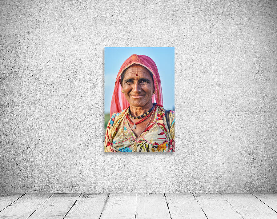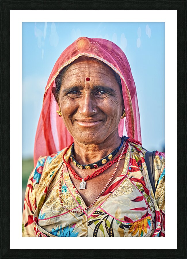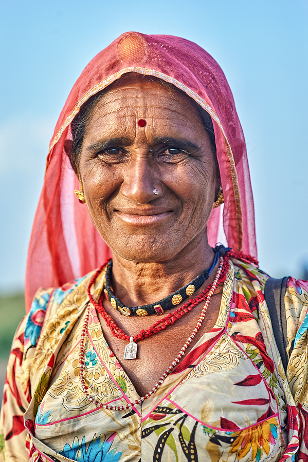An old woman smiles wearing traditional clothes and a scarf in Khimsar Rajasthan. She is enjoying the outdoor setting with a clear sky.