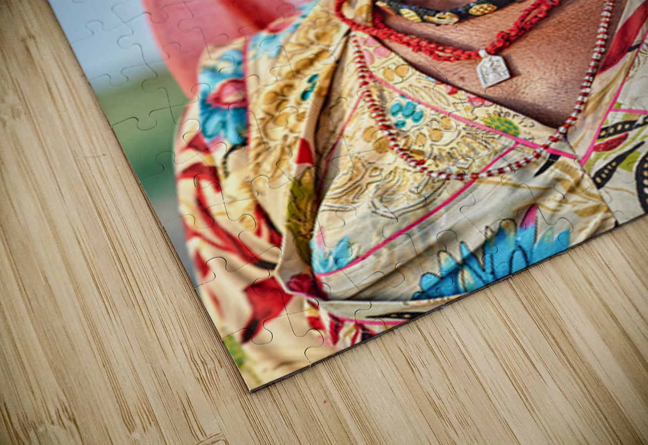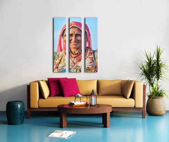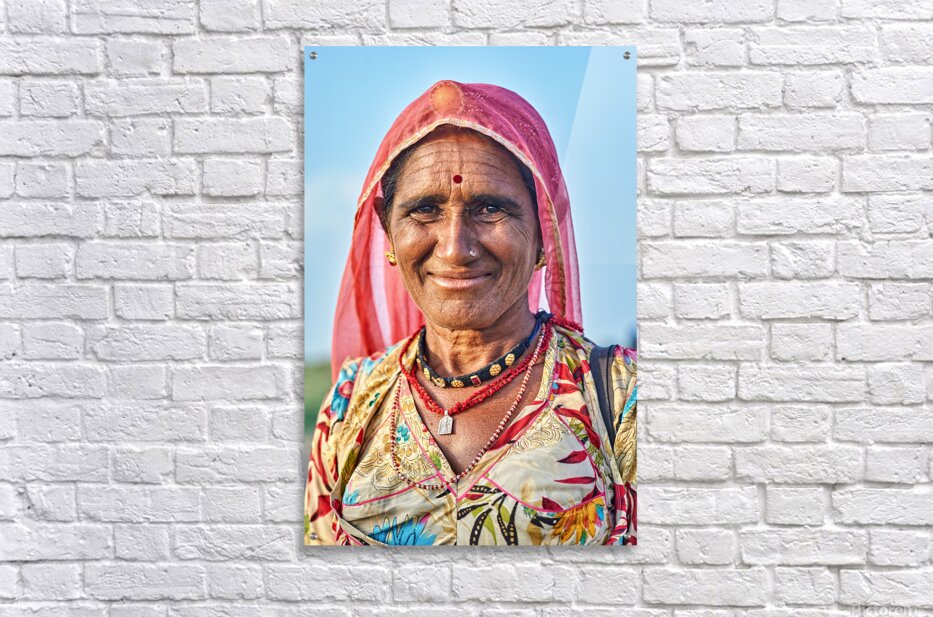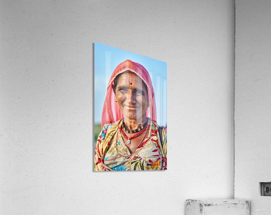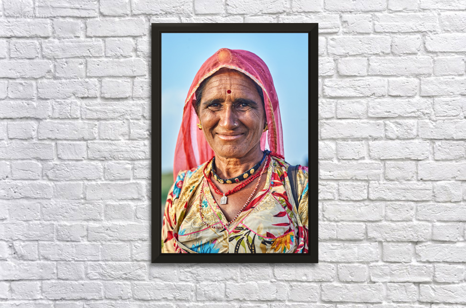 An old woman smiles wearing traditional clothes and a scarf in Khimsar Rajasthan. She is enjoying the outdoor setting with a clear sky.