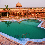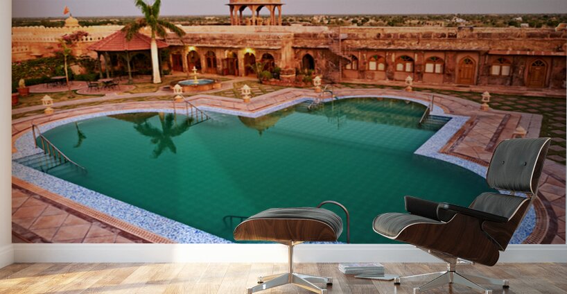 The pool at Khimsar Fort reflects the sunset sky. Guests enjoy the view from the property overlooking the landscape.