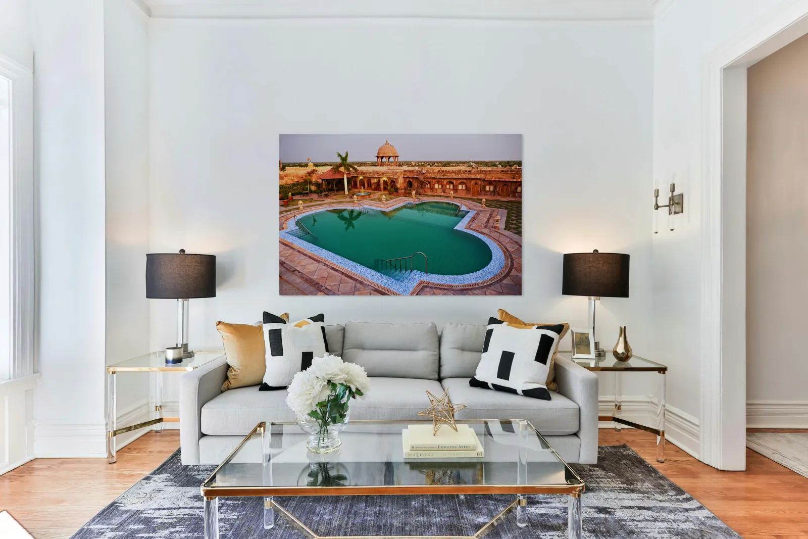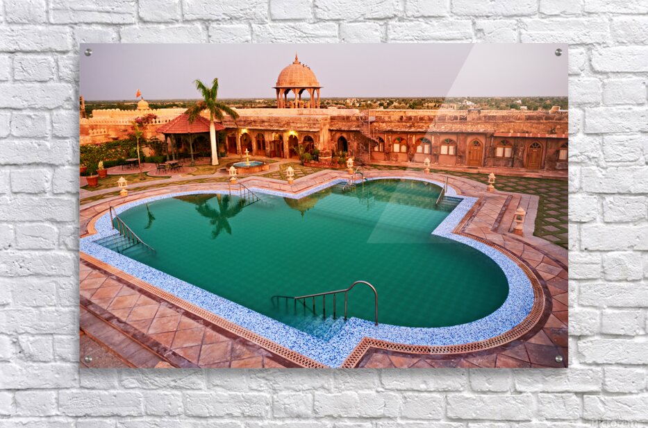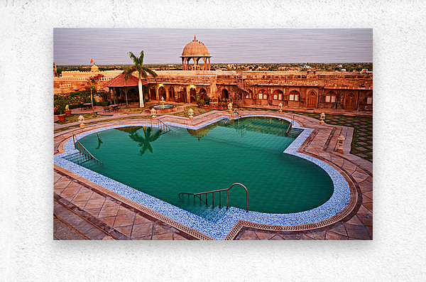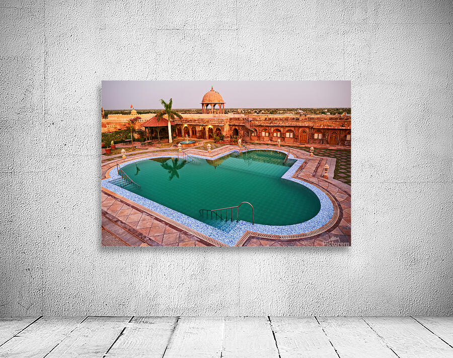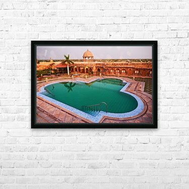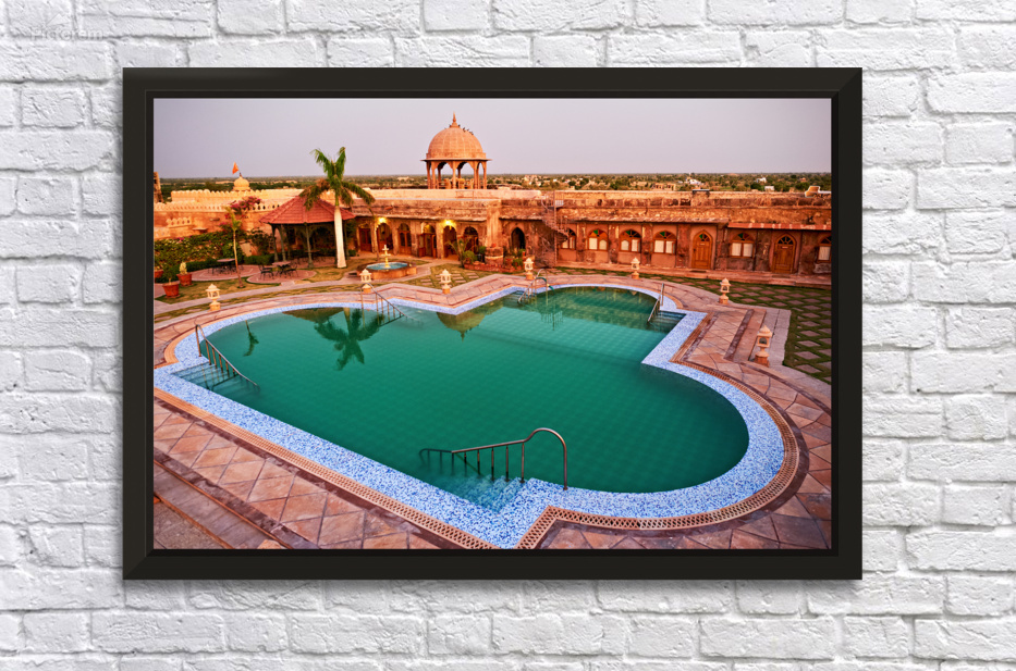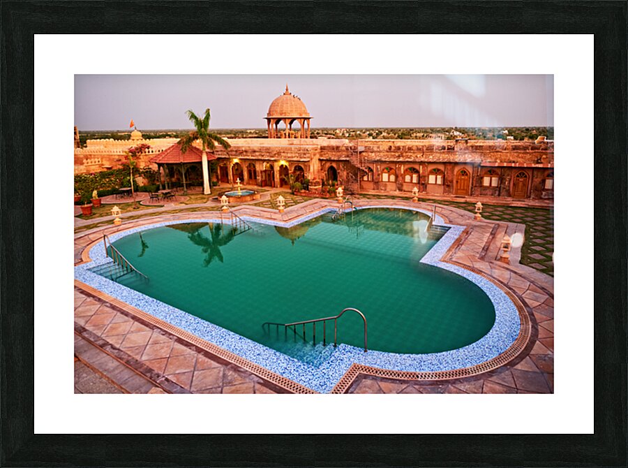 "Khimsar Fort pool area in Rajasthan during sunset" in a framed print.