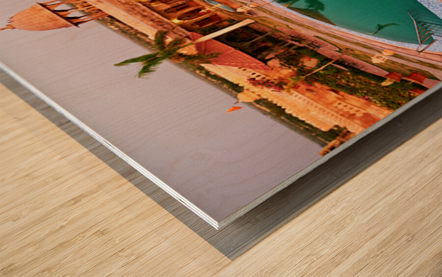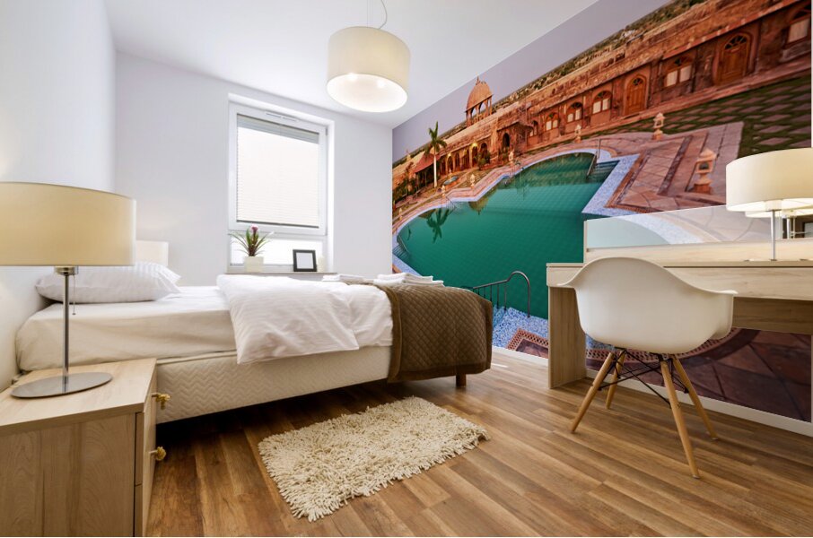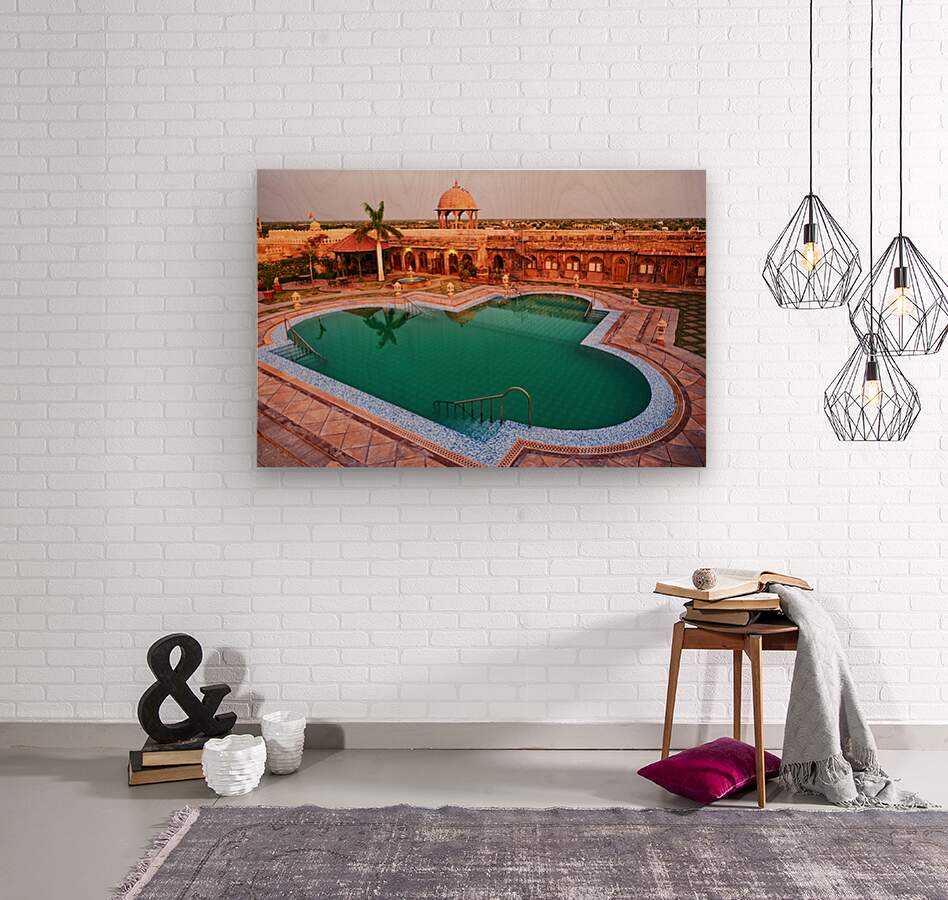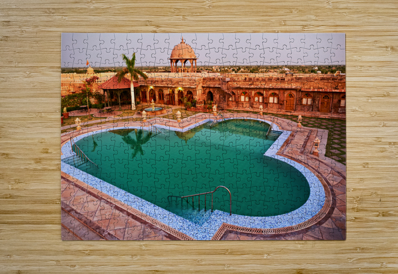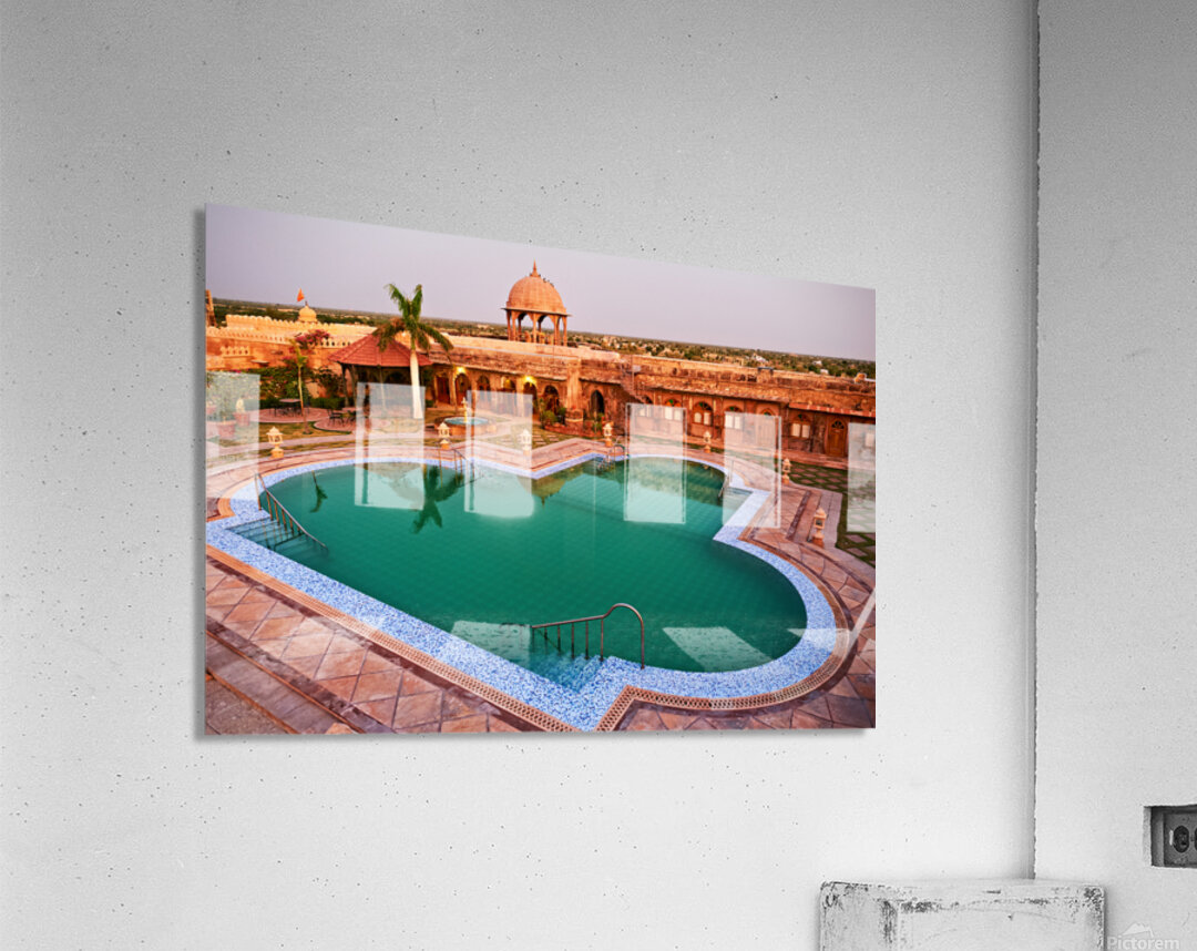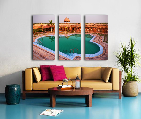 "Khimsar Fort pool area in Rajasthan during sunset" in a framed print.