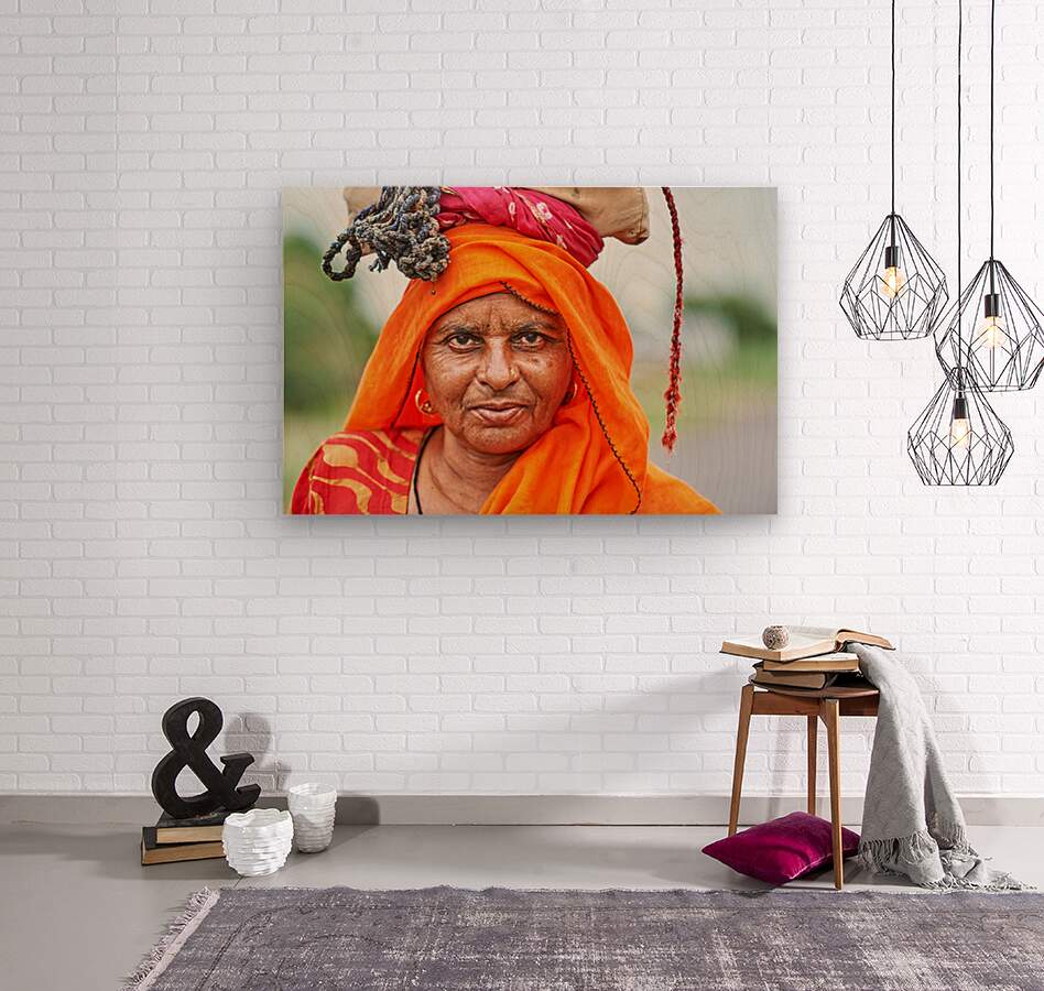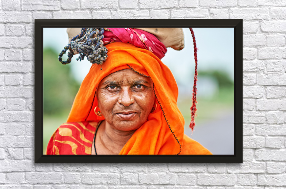 An old woman stands in Rajasthan India. She wears bright clothing and carries a load on her head. Her expression shows strength and wisdom.
