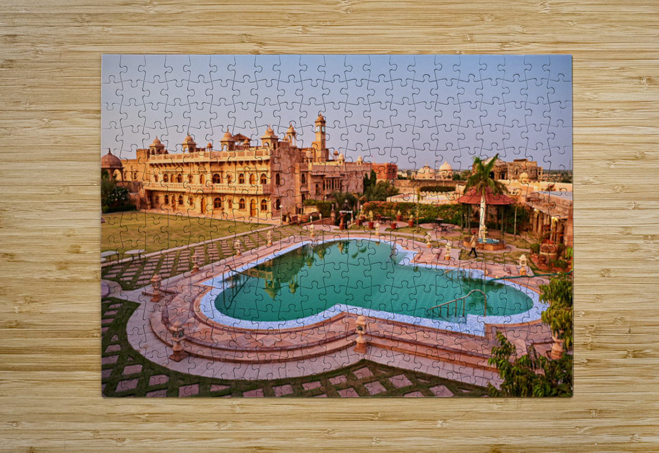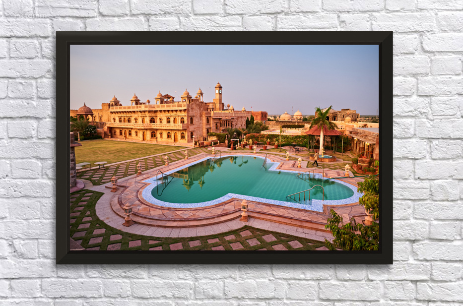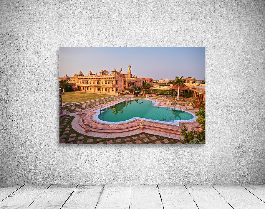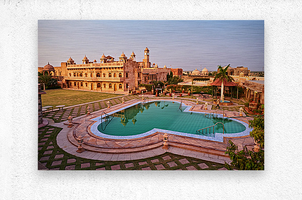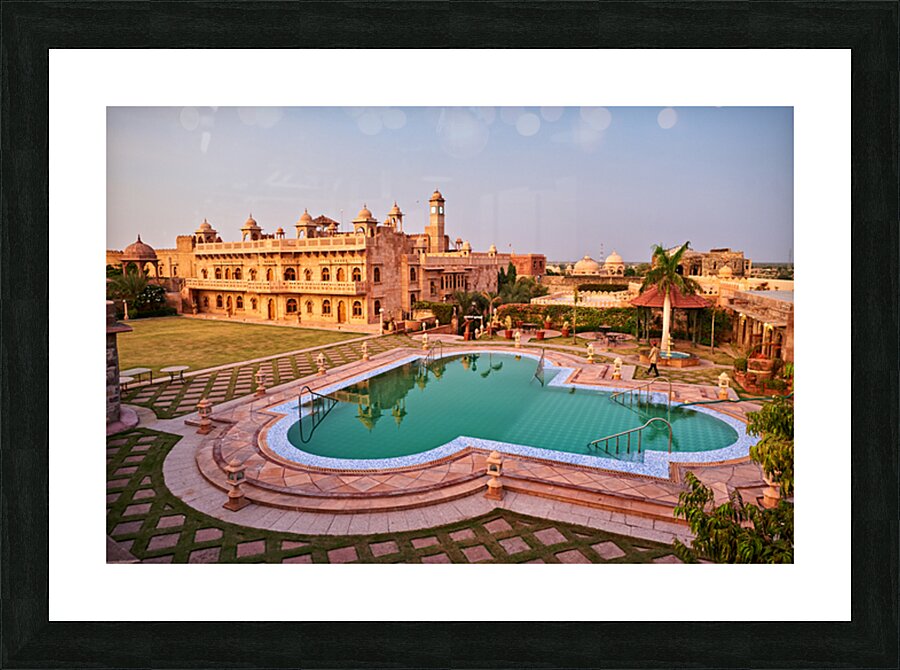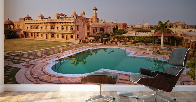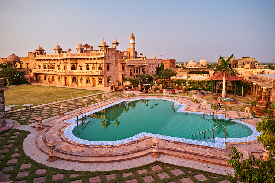 People enjoy their time by the pool at Khimsar Fort. The fort is a historical site in Rajasthan surrounded by gardens.