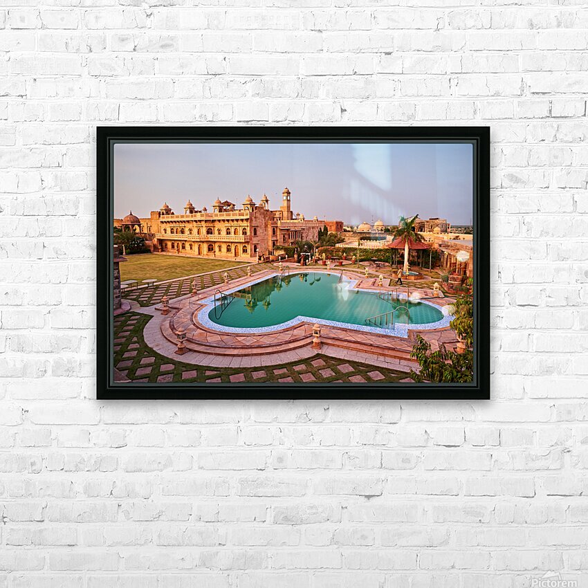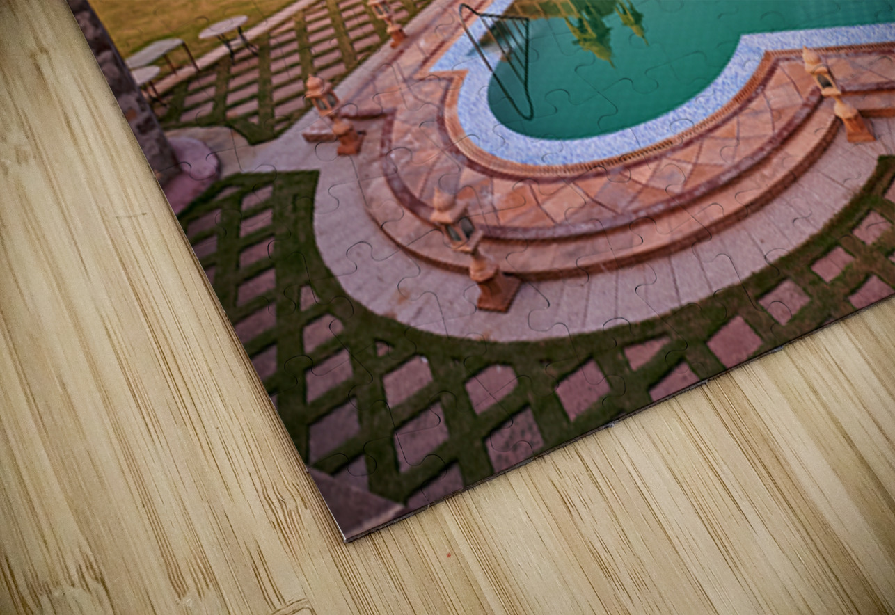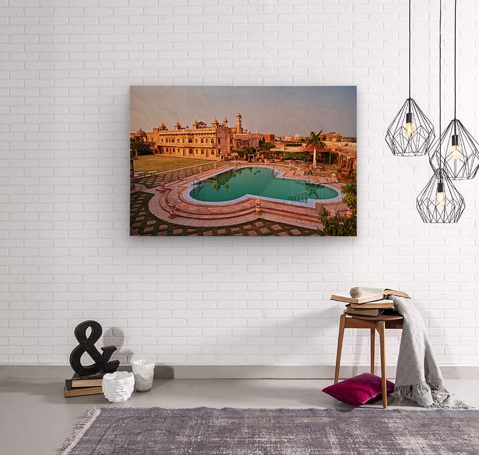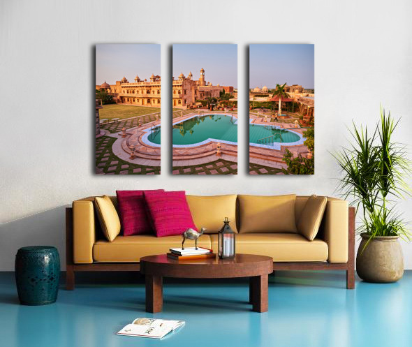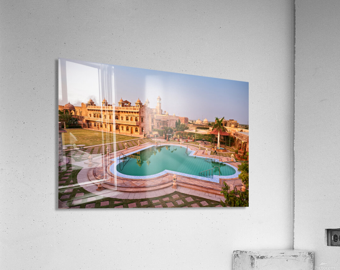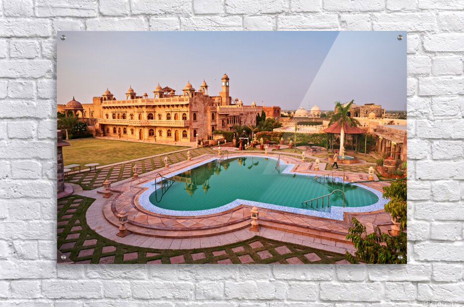 People enjoy their time by the pool at Khimsar Fort. The fort is a historical site in Rajasthan surrounded by gardens.