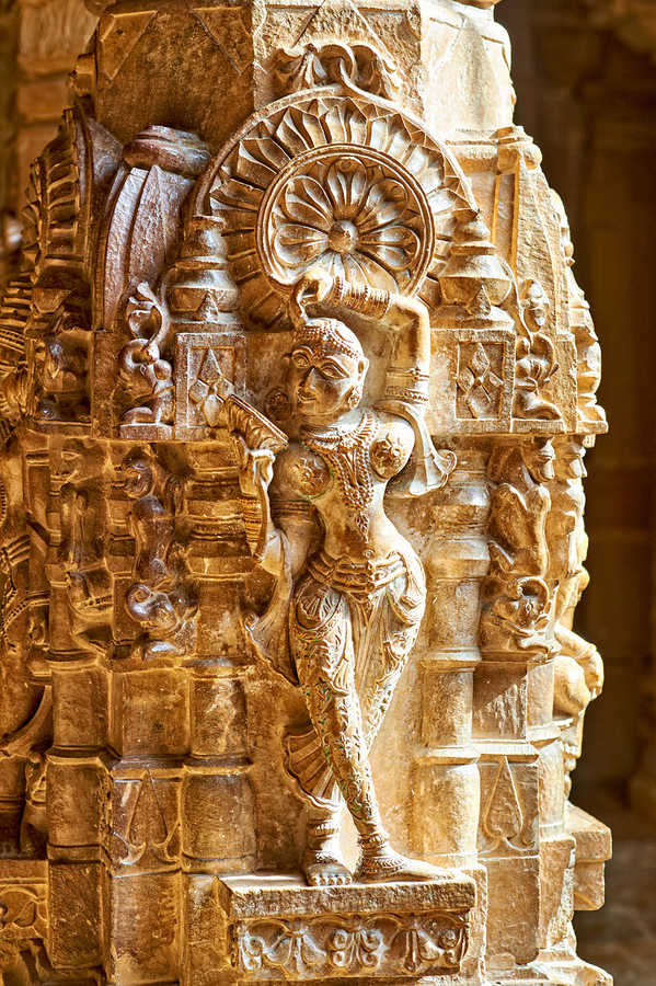 Visitors admire intricate carvings at Sri Jaisalmir Lodravpur Parshavnath Jain Temple in Jaisalmer Rajasthan. The temple is rich in history.